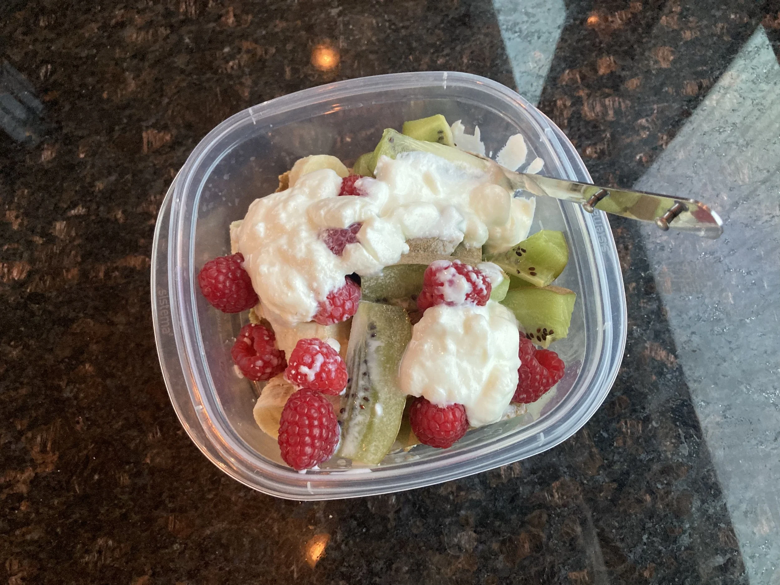 My morning routine was back with a vengeance though. I cleaned out the coffee machine, a Keurig K-Duo Essentials™ Single Serve & Carafe Coffee Maker, and put a fresh pot on. While this was dripping away I sliced a banana and a kiwifruit and entered them into my bowl of great grains cereal, Blueberry Nut Crunch, naturally flavoured, with real delicious BLUEBERRIES. Several spoons of yoghurt were then added along with some fresh raspberries, and finally a few glugs of milk. I even went a bit further yesterday and boiled some water to give my bowl a special treat when I washed it.