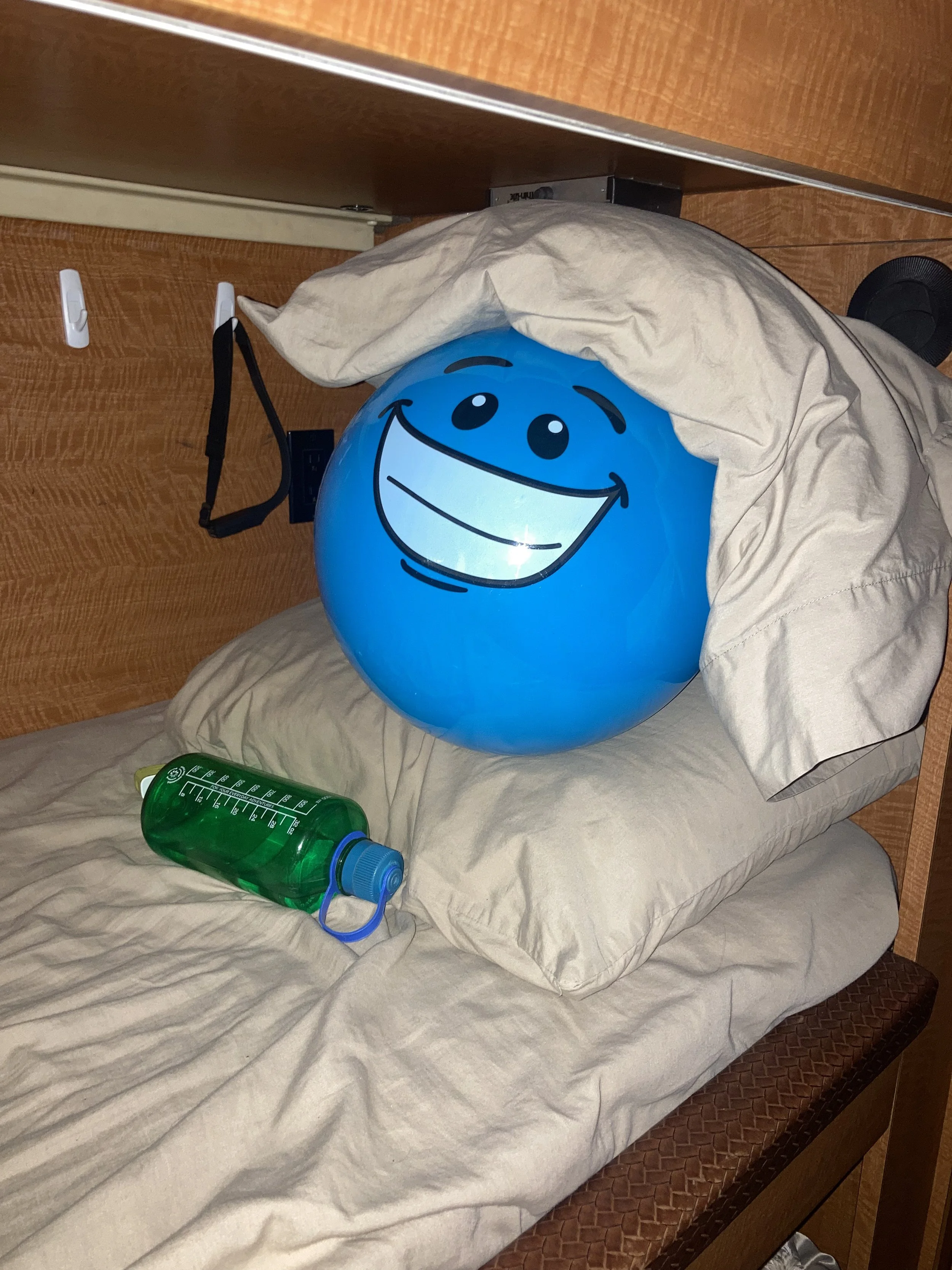 I got hit with a deadly prank. This is my bunk, and the ball I won in the Space Alien Grill & Bar Arcade.