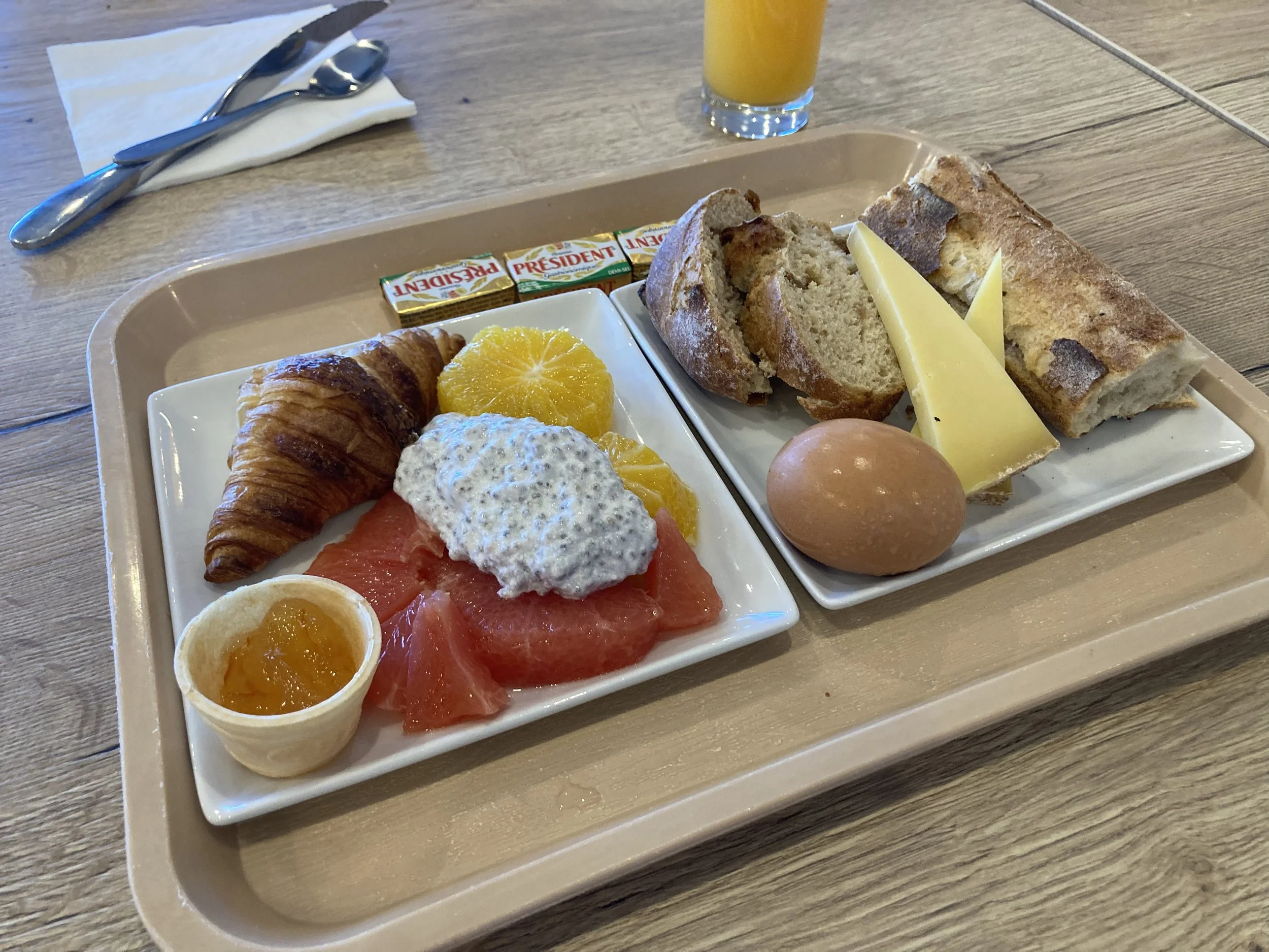 Our body clocks are all aflutter after pivoting between so many early and late starts, and so yesterday I woke up at a frustrating 8am, and after spending quite a while trying fall back asleep, I gave up and headed downstairs to have a pick at the breakfast buffet. I didn’t let the tiny square plates hold me back and served up a generous spread with baguette, fig bread, croissant, cheese, outdoor egg, orange, blood orange, chia seed pudding, and a crousti’ cup with marmalade. There was an orange juice machine in the restaurant, a proper one that squeezes real oranges, and I enjoyed several glasses of juice while feeling sorry for the person that would have to clean the insides of this machine afterwards.