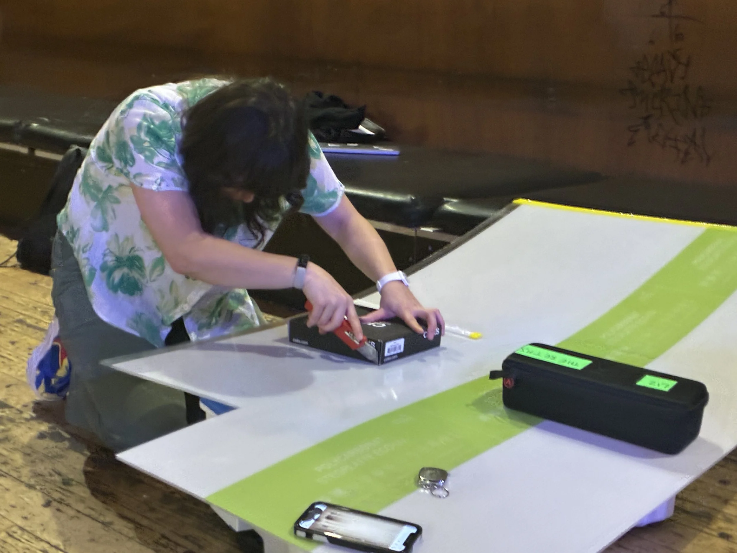 Liz turned up at lobby call with a 2.4 metre sheet of UV-stabilised corflute which must have been a nightmare to carry back from the hardware store. As well as being a great value cladding for carports and pergolas corflute is the material of choice for The Beths pedal boards (™ ™ ™) being both extremely lightweight and strong when laminated correctly. As a band that is obsessed with optimisation this opportunity to shave half a kilogram off our suitcase weight is gold plated, or perhaps just lightly gilded.