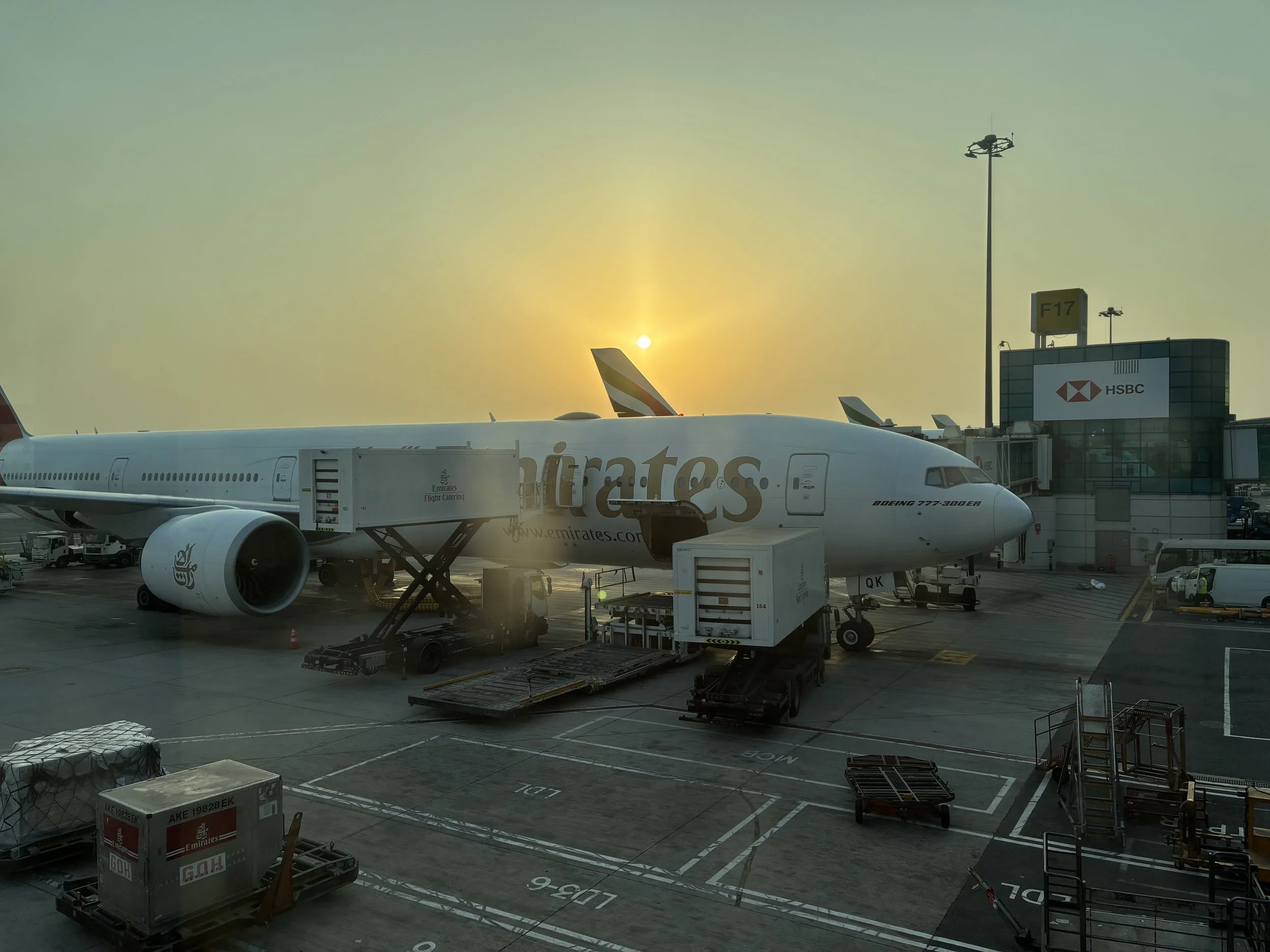 The cabin lights dim and the seats recline as you cross northern Australia and then pass over Indonesia, Malaysia, and the Bay of Bengal, spanning the Indian subcontinent, and then finally descending above the Gulf of Oman for a predawn landing in the brightly illuminated Dubai airport.