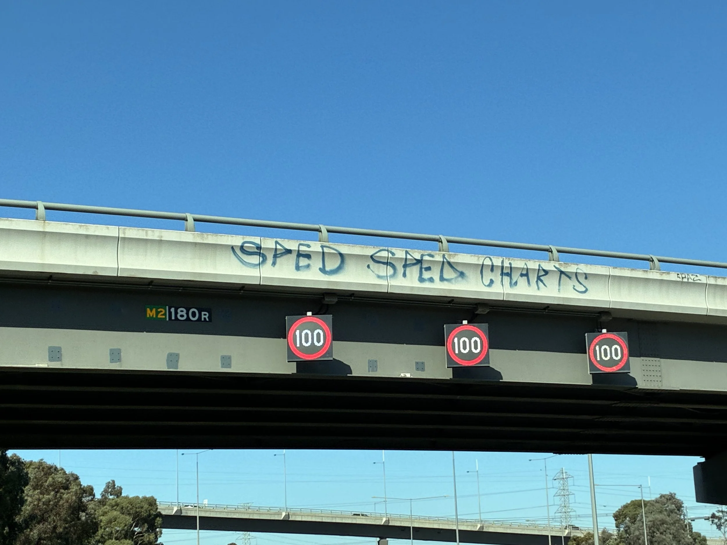 There were some fine examples of graffiti on the many overbridges that cross the M2 motorway. This was my favourite example seen on the M80 Flyover in the suburb of Tullamarine.