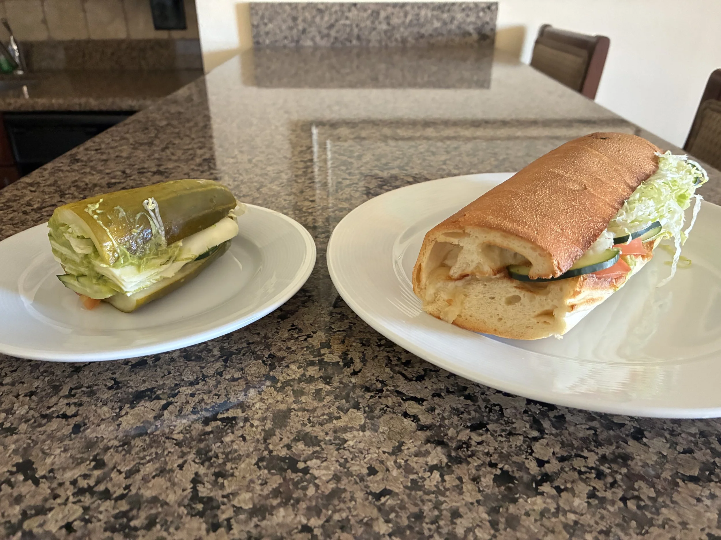 Tristan and I ventured bravely out past the freeway to get breakfast, walking the footpath until it ended, and then traipsing through whichever parking lots had the bad luck of getting in our way. Of all the terrible chain restaurants in the vicinity of our lodgings Jimmy John’s seemed like the safest option to provide sustenance for the first part of the day and I ordered myself a toasted Club Tuna, with provolone, tuna salad, cucumber lettuce and tomato. On the side I had a Picklwich, a stunning creation made from a hollowed out dill pickle filled with tomato, cucumber, cheese, and lettuce.