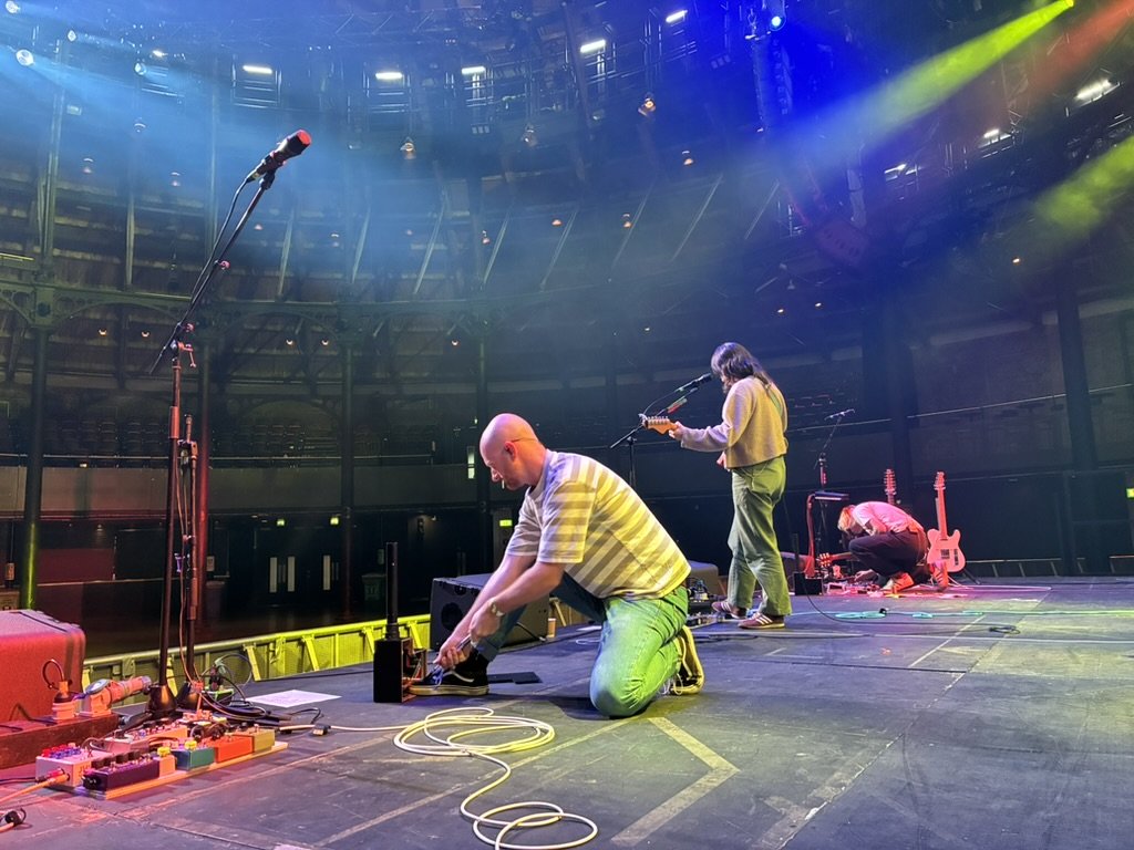 The Roundhouse crew were fast and professional. Speakers were placed and wired up, microphone stands emerged, power cables were run around the stage for our equipment, and risers were set up for the drums and amps. A long pole was lowered at the back of the stage, and the banner was hung. As we assembled our instruments and equipment the bar was being stocked, and the merch was being counted and laid out.