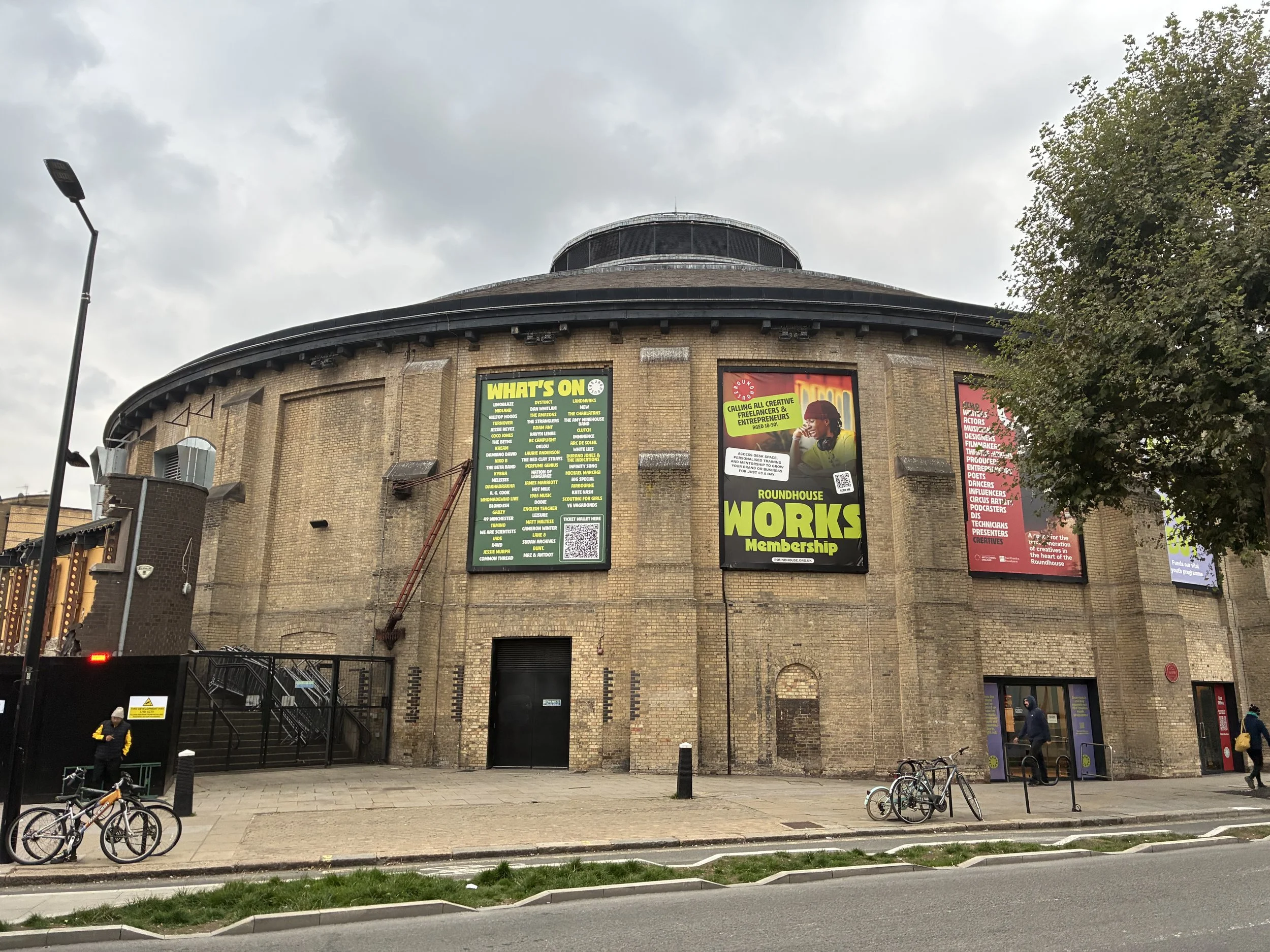 Teddy drove us into London. This is one of the world’s great traffic cities and it takes an extraordinary amount of time to cross it in a motor vehicle. After a good ninety minutes of dribbling through London’s backstreets we spotted the conical shingled roof that sits atop the Roundhouse, a huge structure dominating the main street of Camden borough. There was a further fifteen minutes of looping through narrow streets and lanes as we tried to find the entrance, until we saw the show promotor waving at us from the gate.