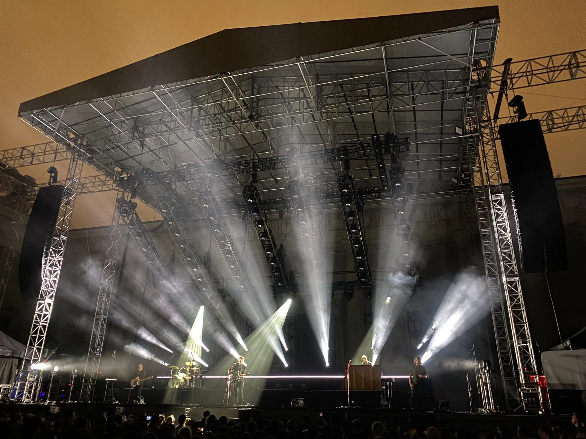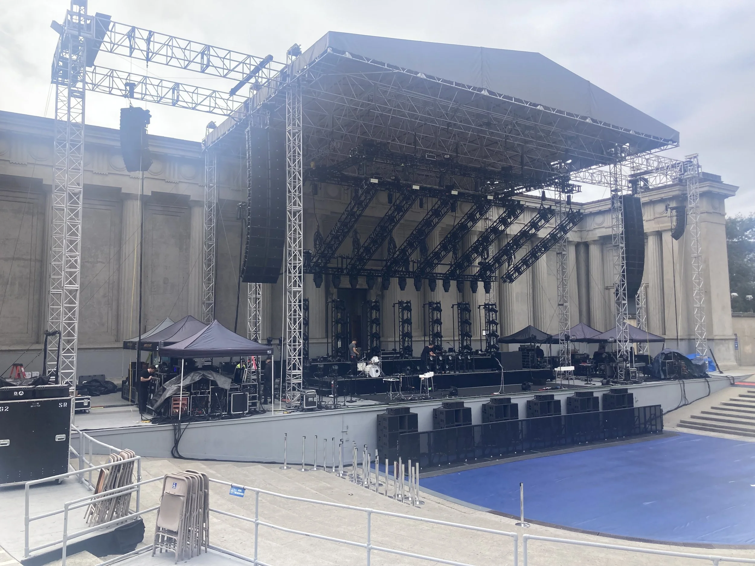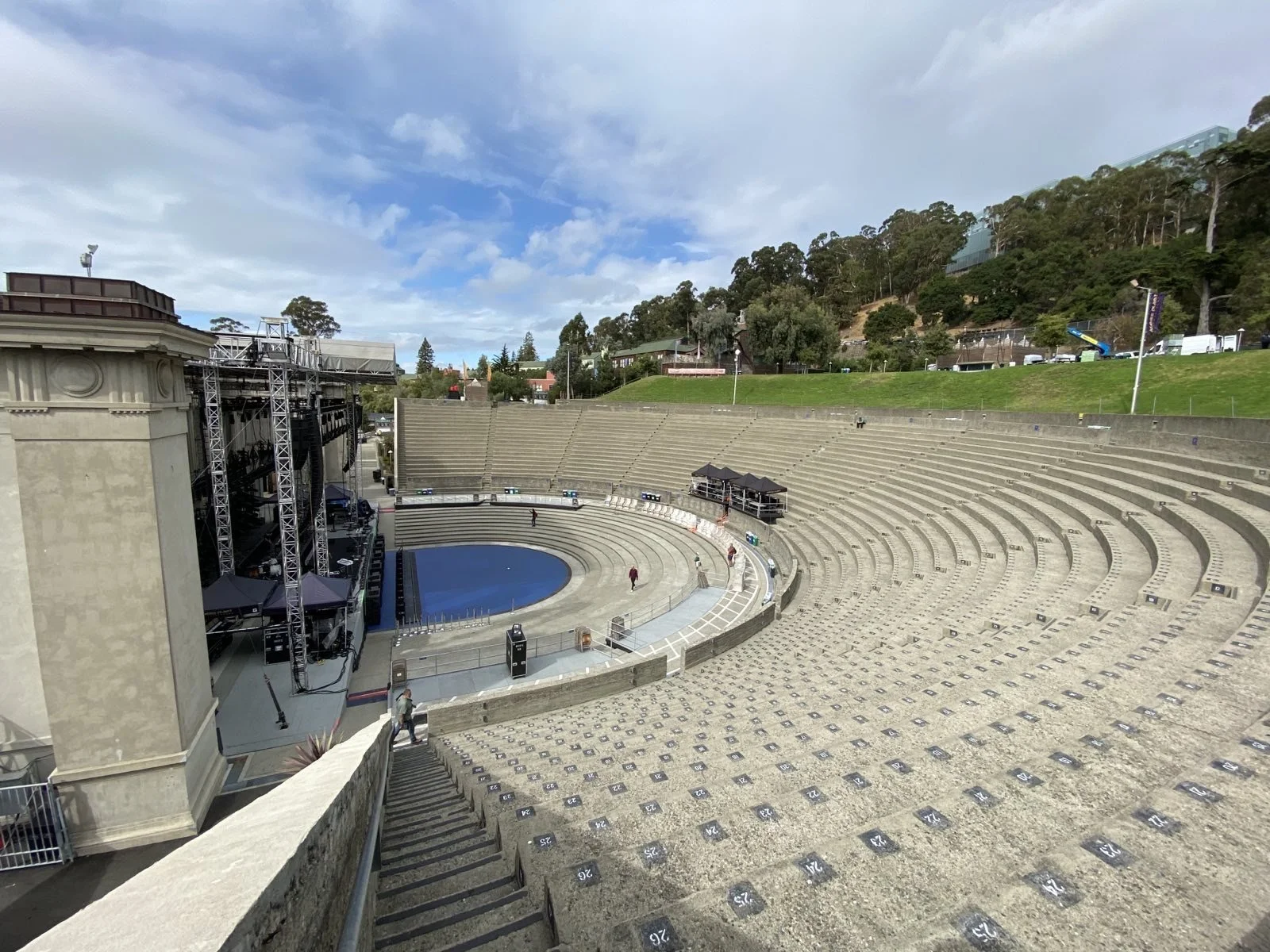 The Greek Theatre is just east of Berkeley’s downtown, overlooking the university campus, and set in a natural bowl at the base of the Berkeley Hills. As you would expect of a Greek amphitheatre there is a classical backdrop to the stage, a freeze running along the top of this structure which is supported by tall doric columns. The seating is very simple; concrete bleaches which rise steeply up the hillside and provide amazing views from anywhere in the theatre. Everything was already in place when we arrived and the crew were putting the finishing touches on their show prep, tidying the stage, tuning guitars and taping down everything they could find. We found our green room downstairs and settled in, waiting our turn to use the stage.