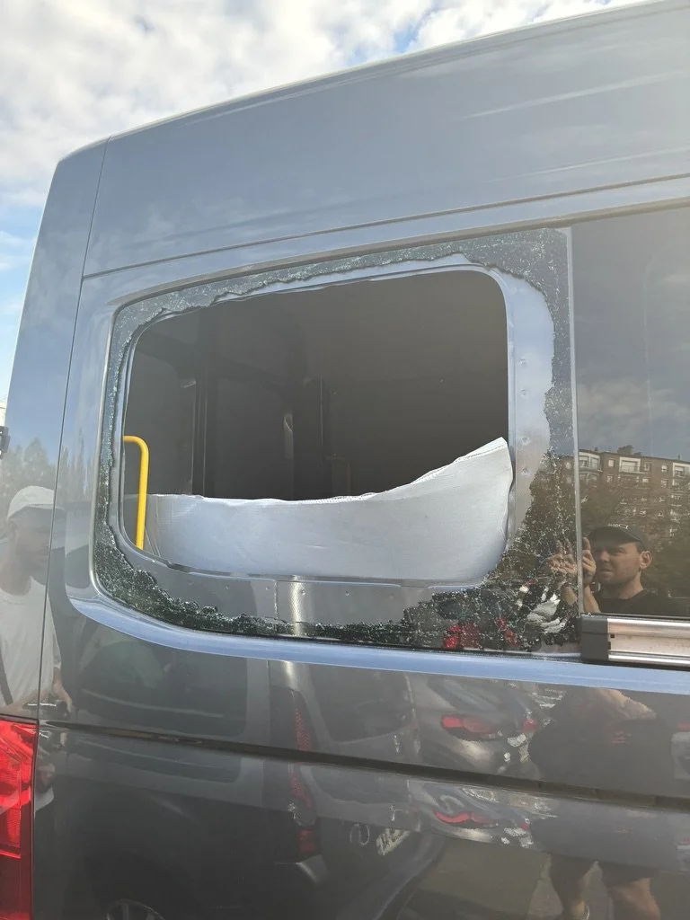 Before I’d even had the chance to touch my food we got a message from our tour manager Justine, that overnight the van had been broken into and all our guitars, cymbals, snare drum, and backline were gone. We all walked to the carpark to see the damage. The front quarterlight window was smashed to get into the cabin and they had managed to go in through the back window, tearing through the plastic panelling of the cargo compartment to get the back doors open from the inside.