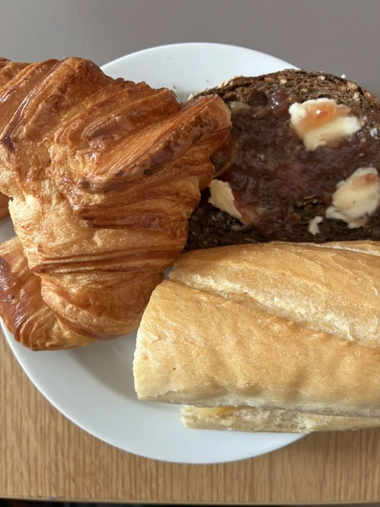 I awoke to a breakfast delivery from a very thoughtful Tristan Deck, a piece of baguette with cheese, a slice of brown bread with butter and jam, and a croissant.