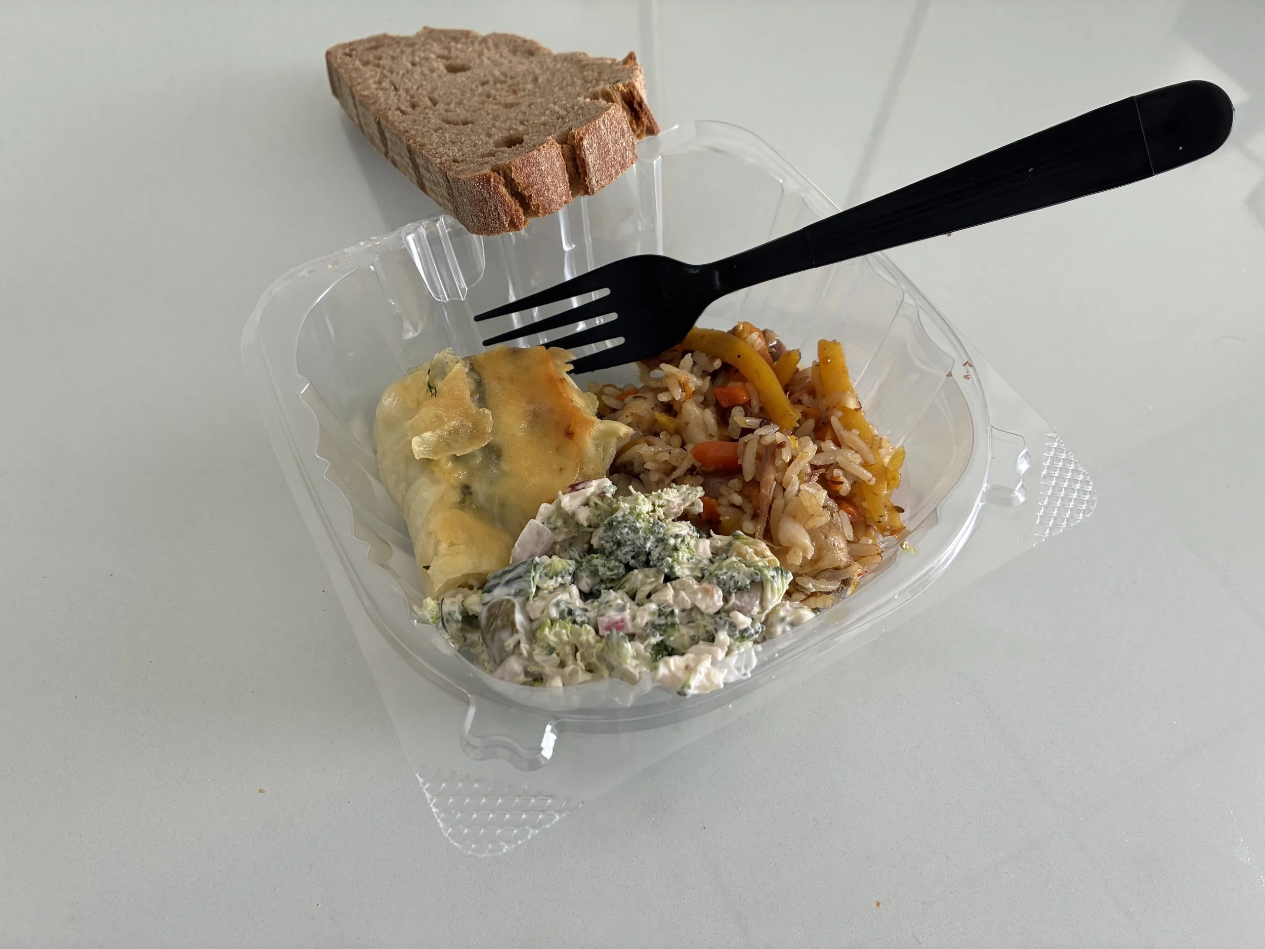 I awoke at 10:40am to the clack of a coffee cup arriving on my nightstand courtesy of my generous roommate who had walked a good distance to save me from the penance of our hotel’s complimentary lobby brew. Tristan was preparing me a breakfast of leftovers from last night’s dinner, and after getting myself ready I wolfed down a small meal of brown bread, lamb plov, broccoli salad, and spinach and cheese borek.