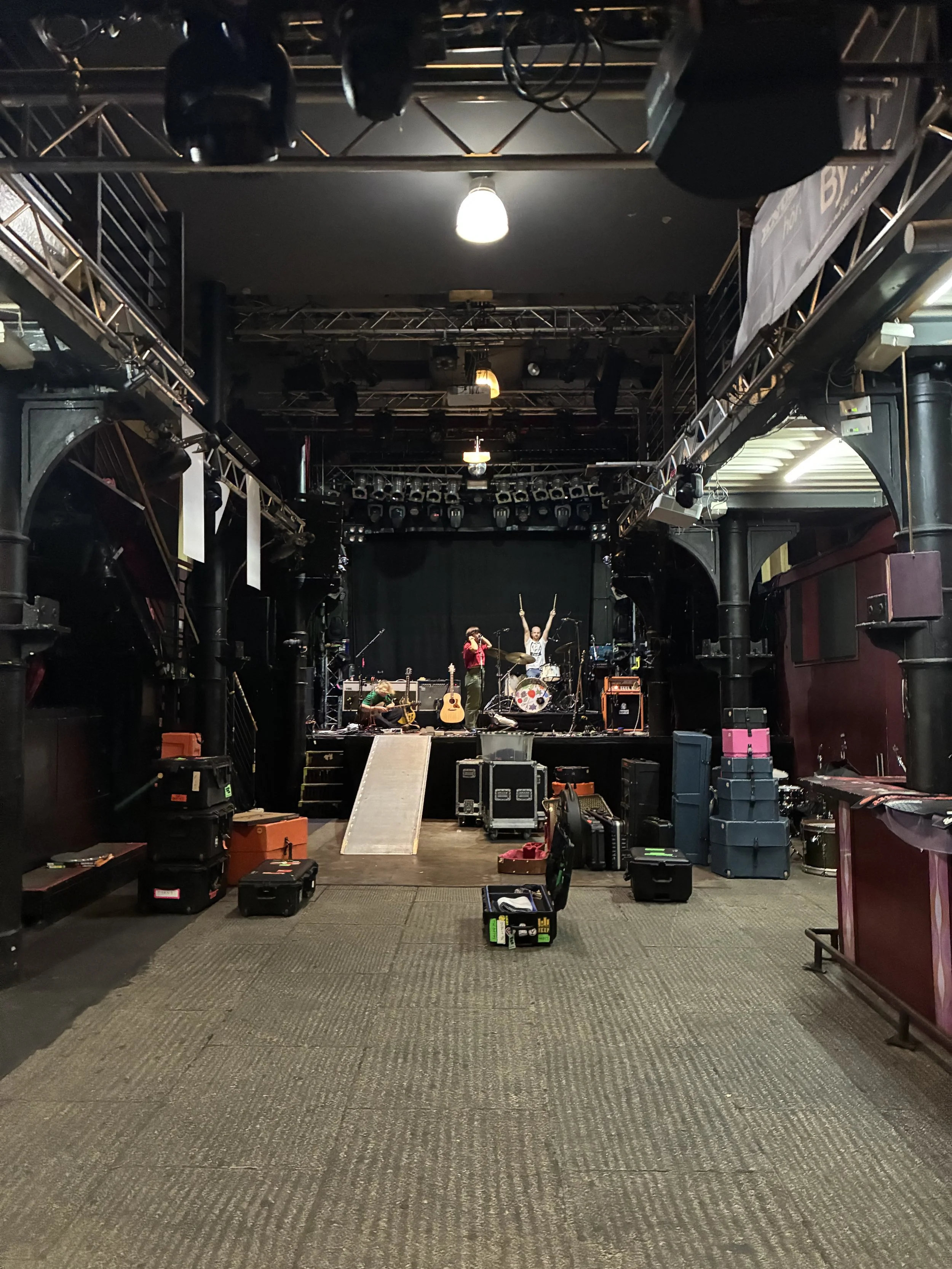 At 5pm we finally reached the venue and jumped straight into loading, 90 minutes behind schedule but confident in our abilities to make up this time without breaching any health and safety standards. Our equipment was carefully lowered from the van using only the most stable postures and we wheeled them across slick, wet cobblestones that could have threatened to topple us had we not used such careful footing and balance. We entered a building that was a pure rock club - dark and a wee bit grimy, walls covered in posters and graffiti, and smelling of fresh cigarette smoke. It was a former abattoir, one of the two veteran techs told me, as he pointed out the old anchor points for the carcass railings that since had been removed. These grisly old technicians had been working at this club since it opened here 22 years ago, and they were as gruff as they were helpful and determined to assist us in putting on a good show.
