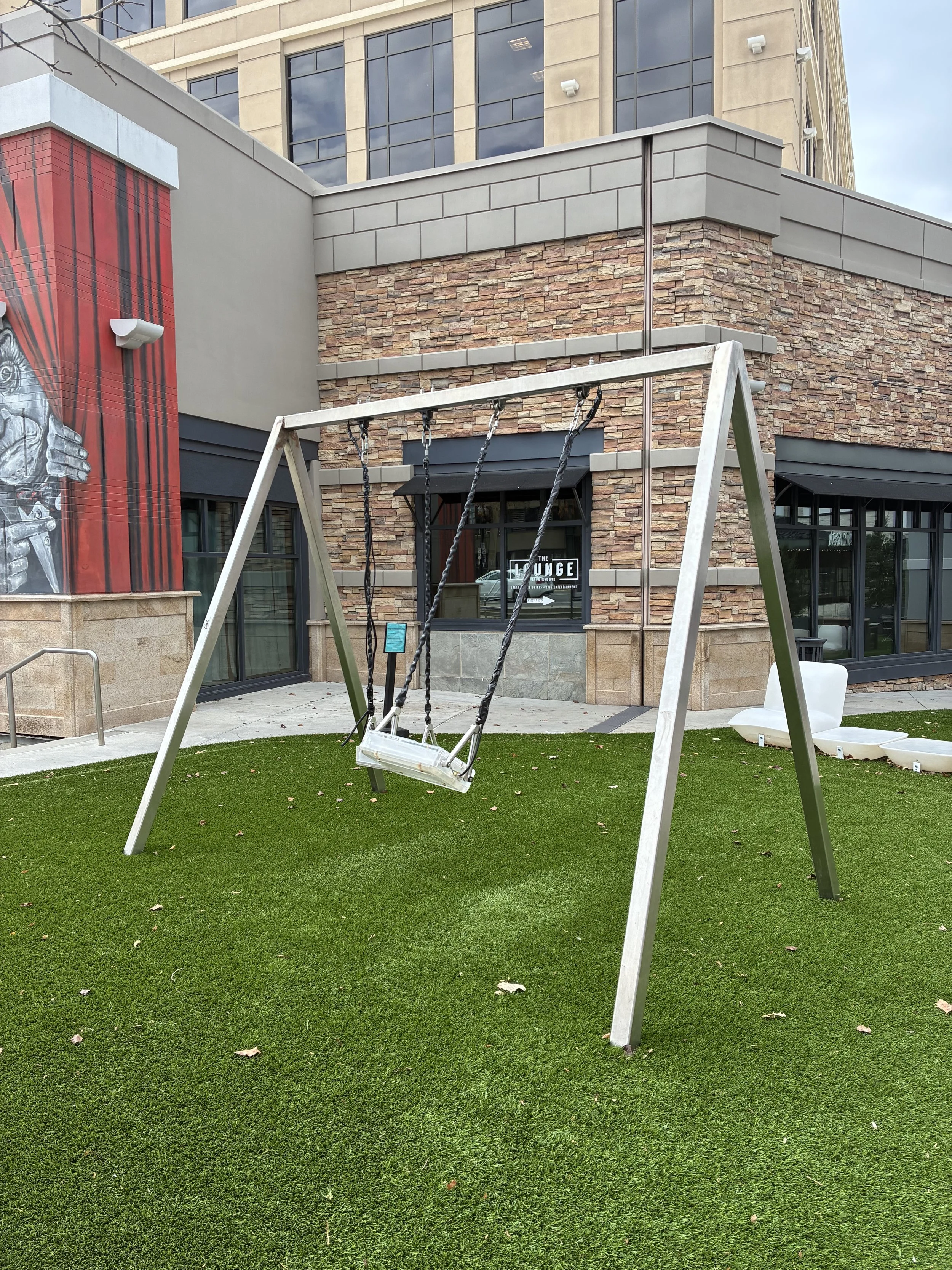 The swingset on the southeast corner of the Gateway Megaplex (next to the “Legends of Rock” mural) was a great place to stop off and although the grass was fake the swing was solid and completely fit for adult use.