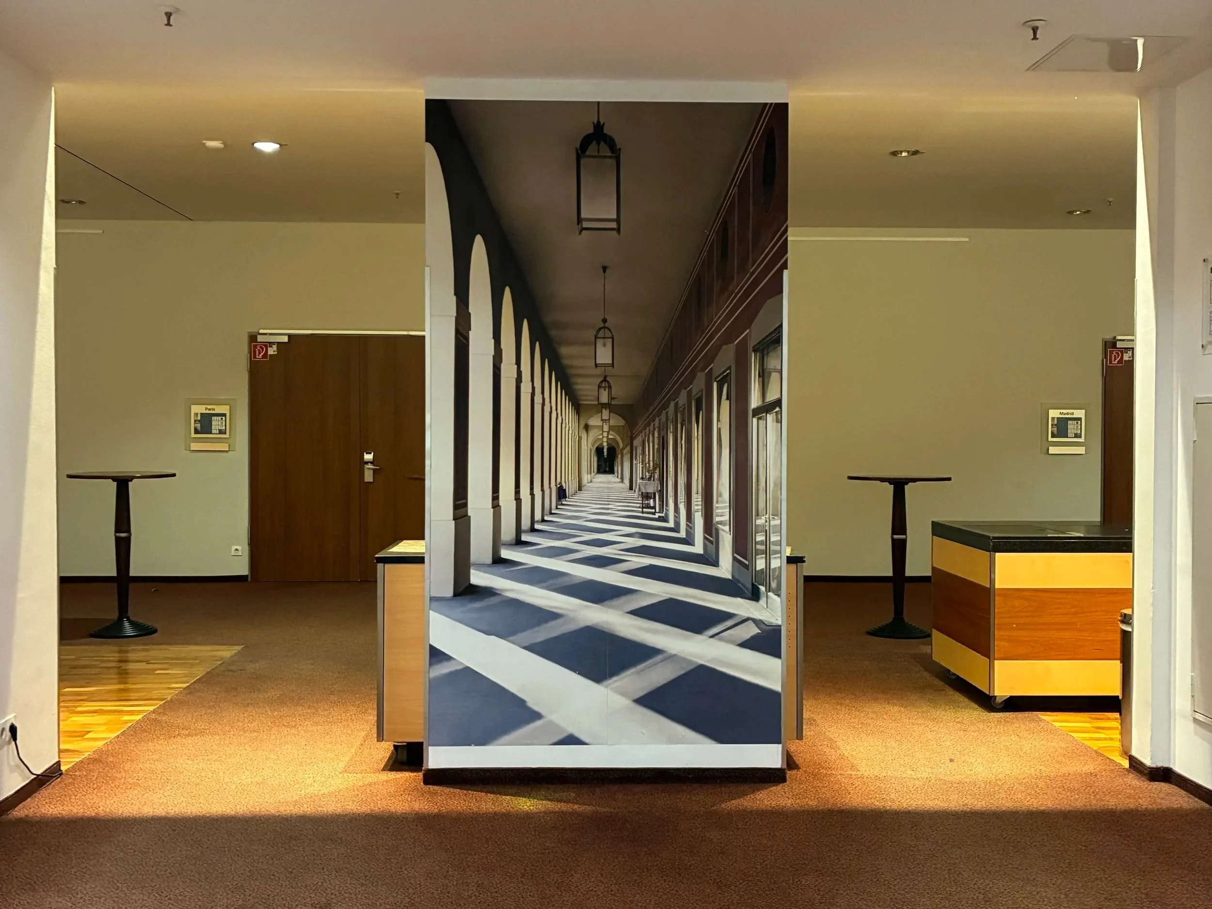 The elevator lobby also carried a very fine piece that could have confused a less astute group of travellers. This uncredited photo brought the breezy feel of a southern European courtyard to an otherwise dull, carpeted waiting area.