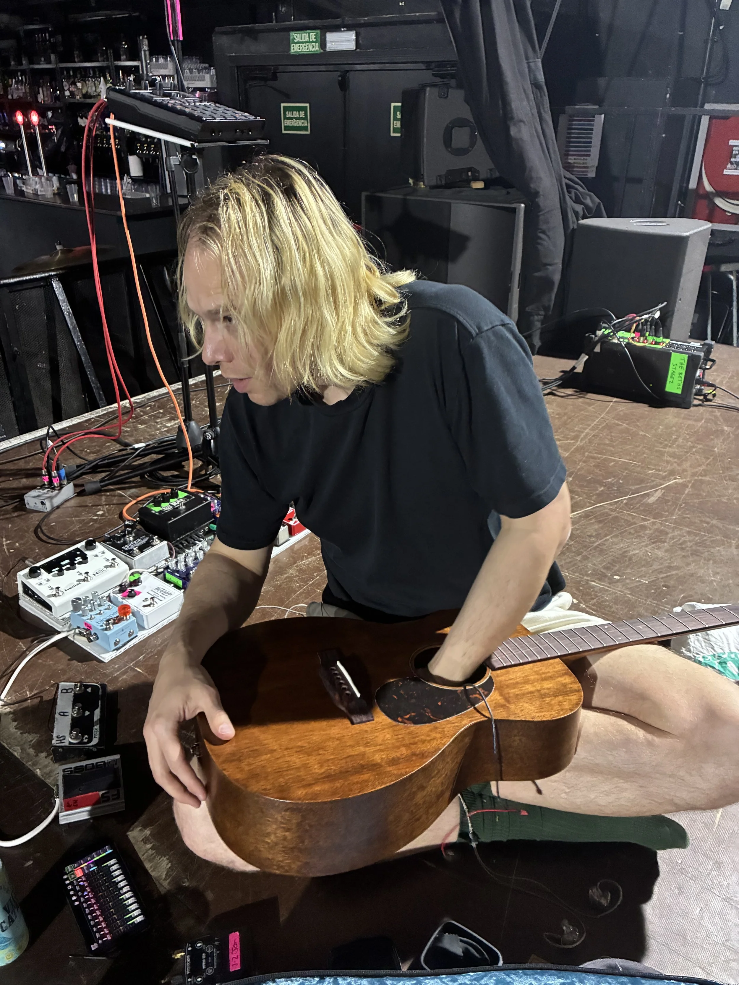 The cavernousness of this room turned out to be quite a hindrance once we fired up the PA system. As I played a low note on my Ibanez Blazer my body was pulverised by the subwoofers under the stage. Fifteen metres away at the sound desk I saw Gabe blur in my vision as the vibrations hit. In those kind of soundchecks you just do what you can and know that it will feel different with a room full of people. We trusted in Gabe, and in the rollickingness of this venue to get us through the evening.