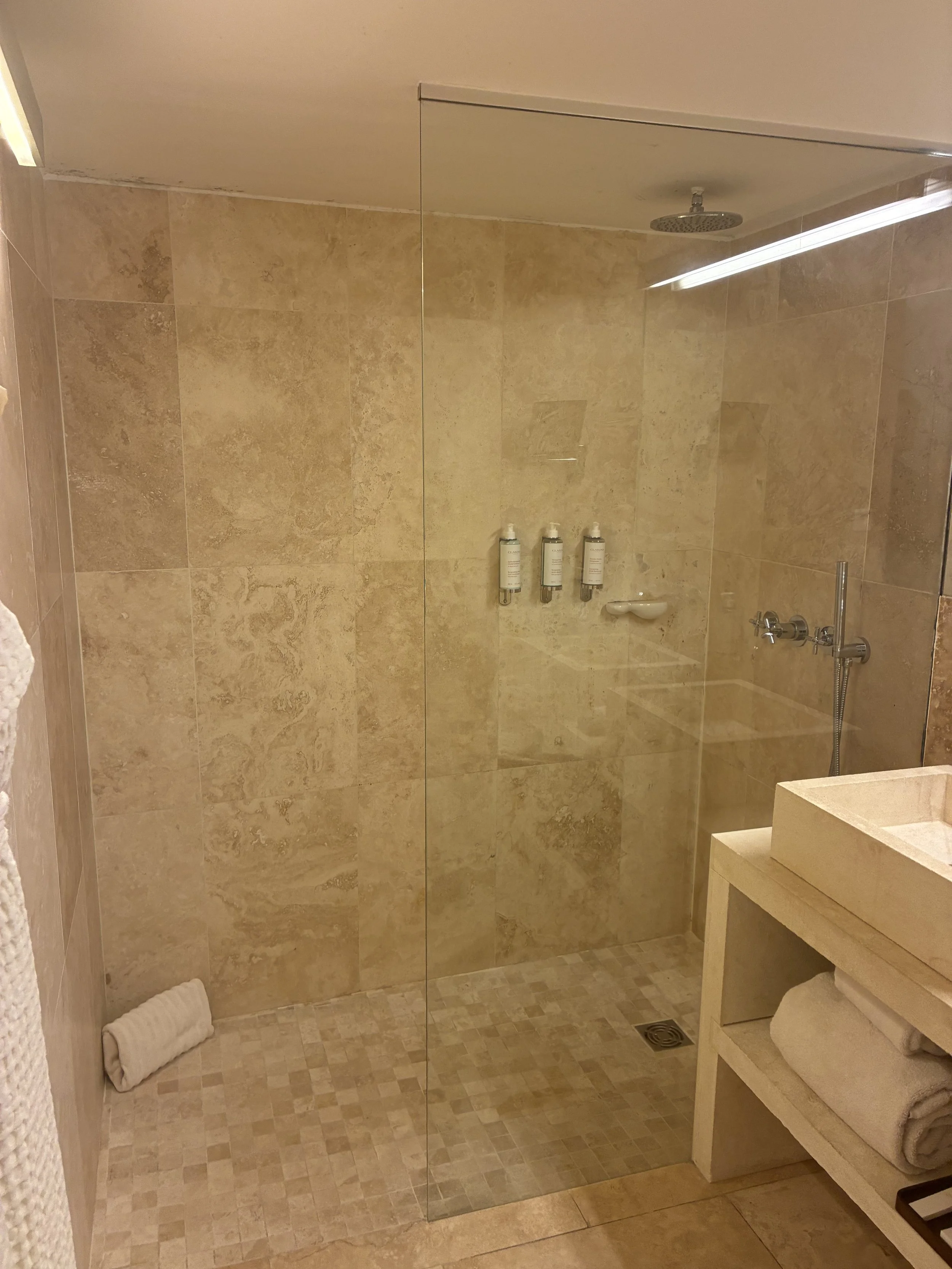 Shower Door Daily checks in today from Castillon-du-Gard, in southern France. Simplicity was the name of the game with this design, a single fixed pane that divided the wet zone from the dry. I liked that the access was easy and there was no step to trip on. I could just stroll in if I wanted. The ceiling-mounted rainfall shower head meant that all any splashing or spray generated by user movement stayed safely in the closed end of the wet zone. As a side note, this was a slick tiling job - a generous amount of fall towards the floor drain meant that there was no water making its way to unwanted areas.
