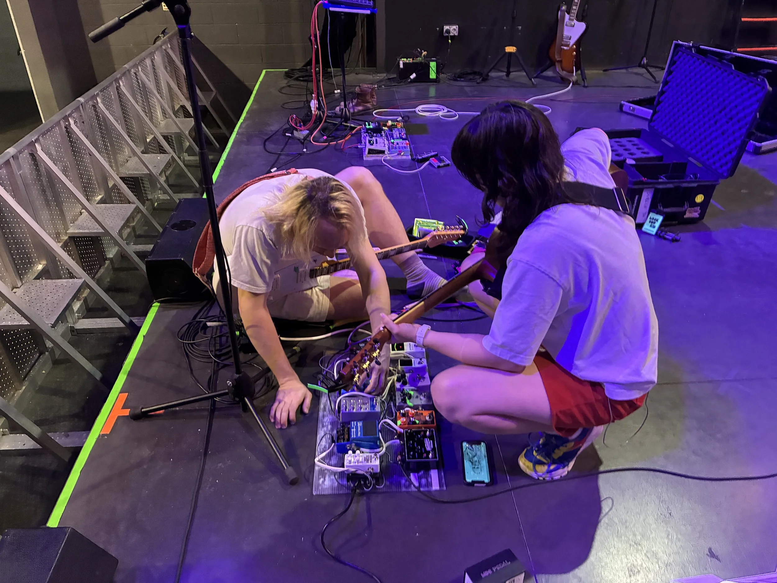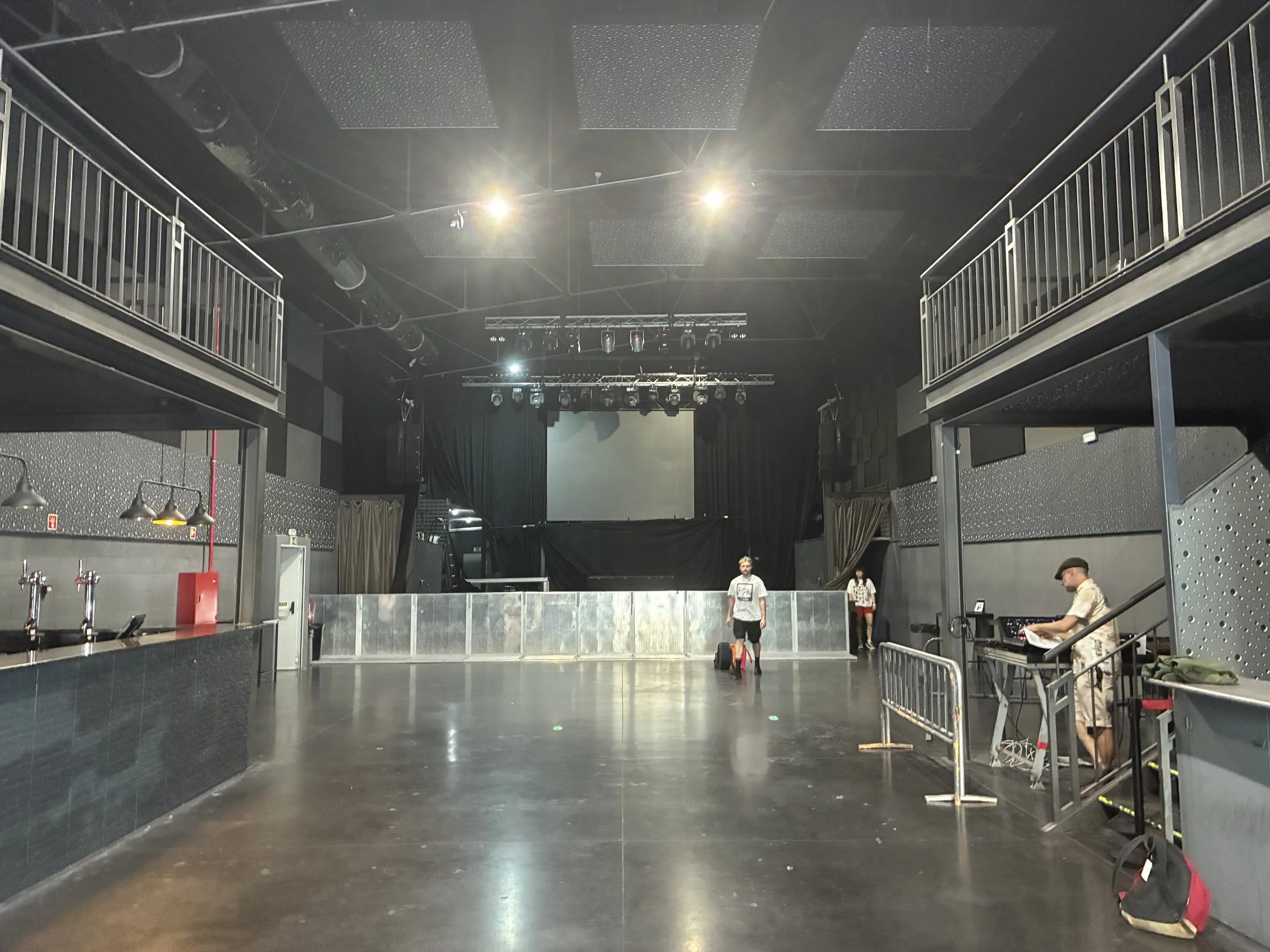 The room at LAV that we were playing felt familiar in its blandness. A polished concrete floor provided plenty of standing room and despite not being an ideal surface to deaden acoustic reflections it did provide easy cleanup for any spilled beverages. There were the usual air conditioning ducts visible to provide an industrial vibe, and of course there was a stage plonked at the far end, hidden behind by stout steel barriers that would protect us from the unruliest of crowds.