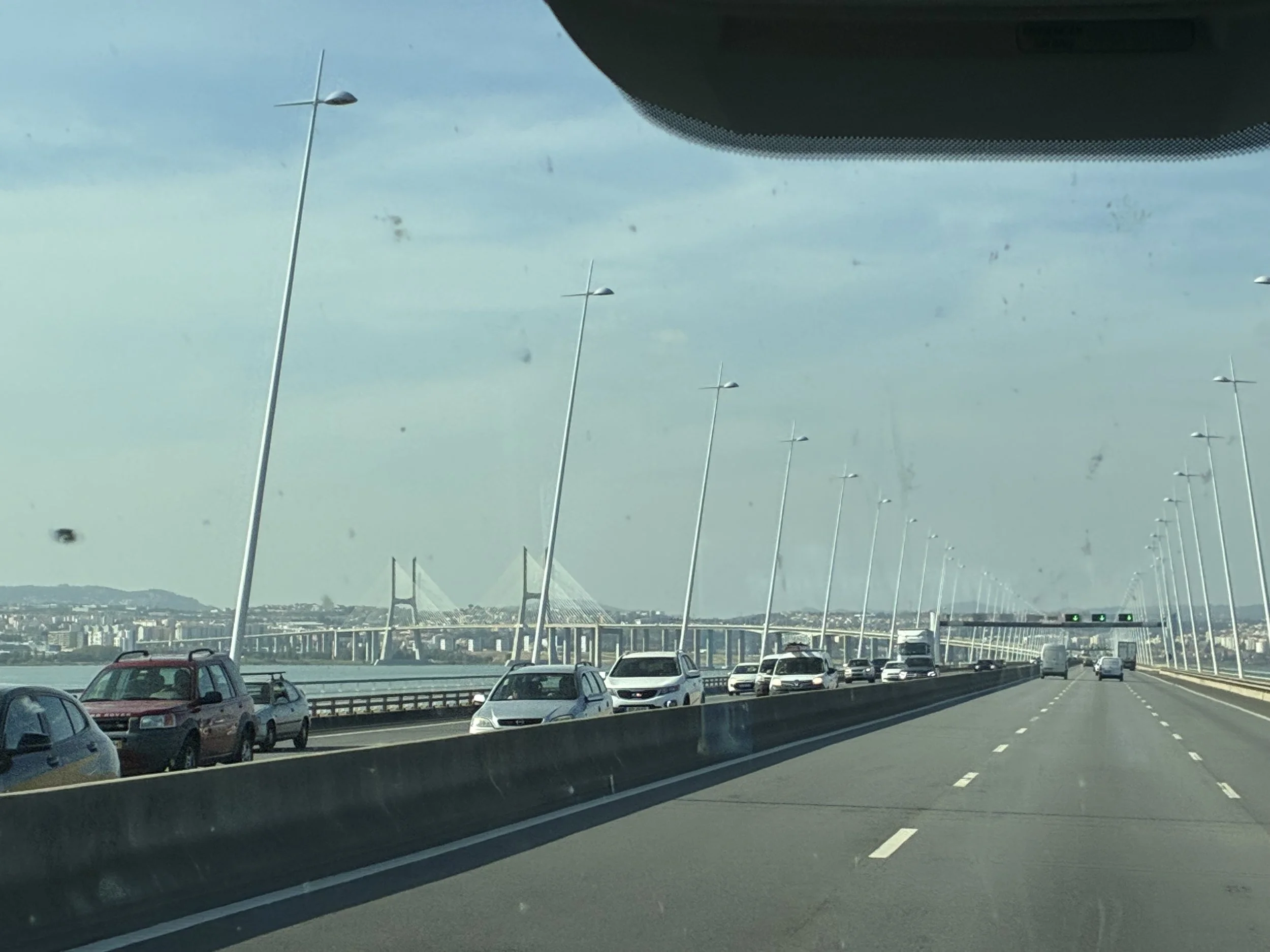 Arriving in Lisbon was one of the most spectacular experiences on this tour. The highway approaches the city from the west but then meets a significant obstacle on the way, the enormous breadth of the River Tagus Estuary, which flows down from the north and turns into a huge harbour with an entrance to the Atlantic. Enter the Vasco de Gama Bridge. A ten-kilometre viaduct carries the roadway out across the water and gradually ascends as it heads towards a huge cable stayed bridge on an approach that seems to take forever, which is not a bad thing as the views of the city are magnificent. Out ahead of us is Lisbon, grandly sprawled over the hills and soaking up the warm weather. Out the right-hand window we can see up the Tagus, the edges of this huge body of water fading into haze in the distance. Out the left-hand window is one of the great harbour entrances, a red suspension bridge spanning this gate to the open ocean. Finally, we reach the cable stayed section, a 420-metre central span 45 metres high that is the climax of this crossing with its steel cables strung tautly from the huge reinforced concrete pillars like the strings of a lyre.
