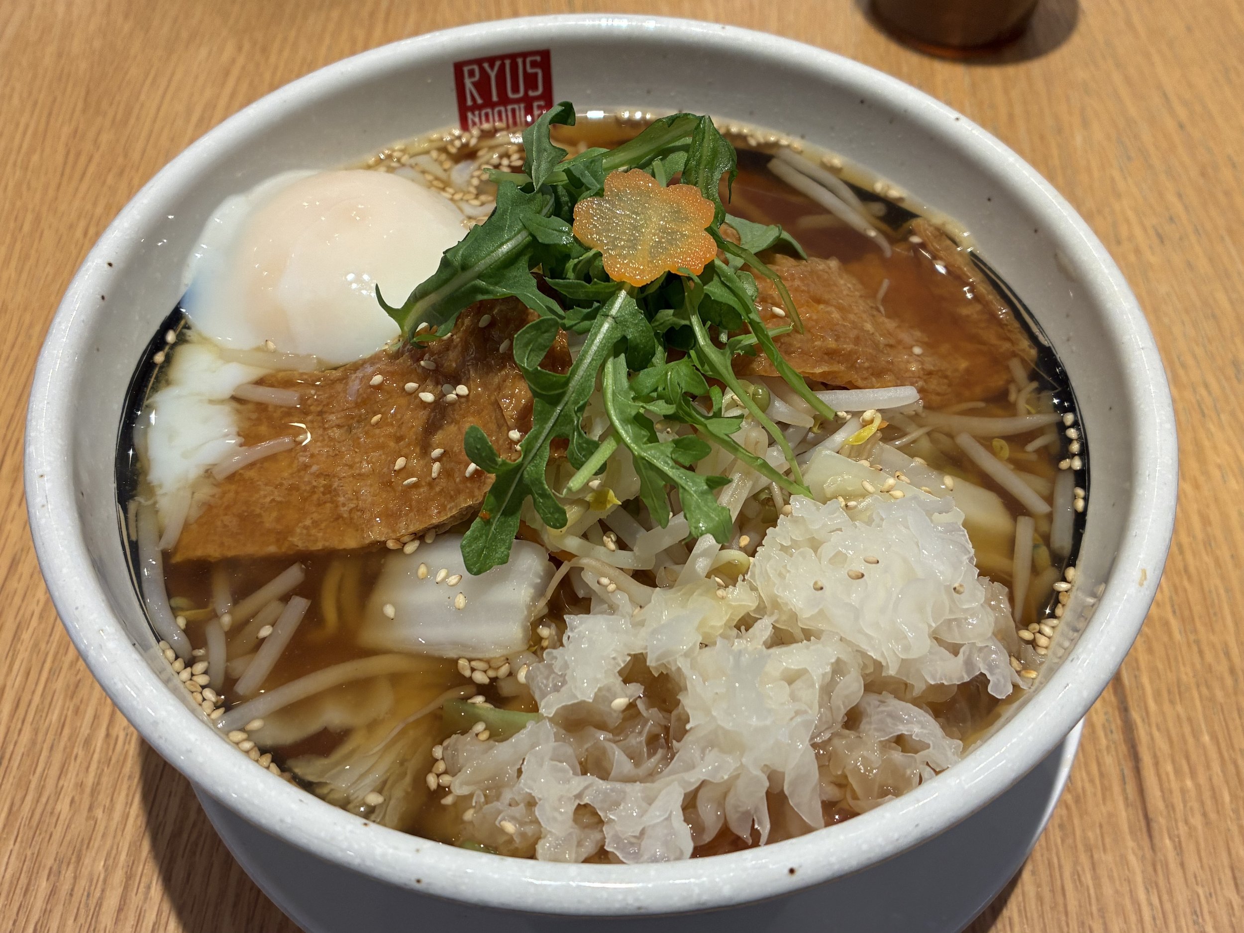 Toronto was intent on providing us with a multitude of weathers yesterday. It was blue skies when I hopped off the bus. Crisp and refreshing and carrying a brisk wind that chilled to the bone. We were parked outside the theatre on Danforth Street and to the west a great cluster of skyscrapers were huddled around Toronto’s downtown. I was hungry and cold and decided to break my fast with a visit to the local ramen joint, a spot that called itself Ryus Noodle Bar. The phonetic that this restaurant name suggested was misleading as most of the dishes contained wheat noodles, but that didn’t put me off for a second. I ordered a vegetable shoyu ramen – carrot, napa cabbage, bean sprouts, sesame seeds, deep fried tofu, arugala, and white fungus with thin egg noodles. The broth was a clear, lightly kelp and shitake mushroom liquid combined with original shoyu sauce.