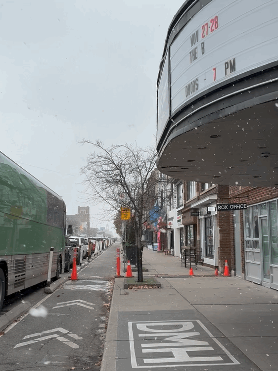 When I left the noodle house it was snowing. It was only a light snowfall, but the wind was picking up the flakes and whipping them along Danforth street with a fury. Everyone on the bus was very excited for the first snowfall of the tour. The skies were grey and for the moment the skyscrapers of downtown were obscured in the haze.