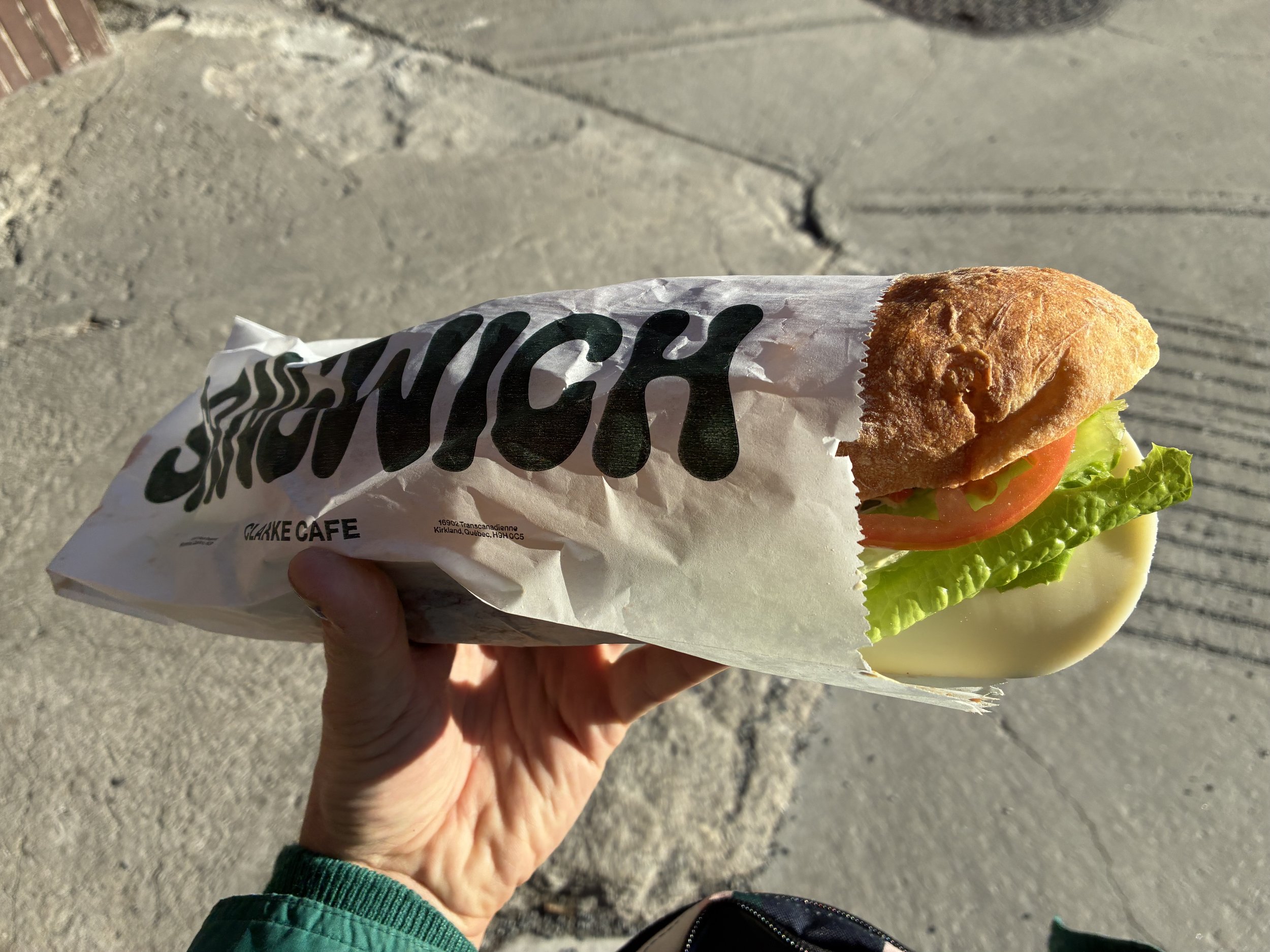 My search for food took me across the Lachine Canal and don’t worry, I stopped for a time to appreciate this stretch of water and its handsome surroundings. It was Saturday morning and there were plenty of walkers and joggers and dogs with very nice winterwear enjoying the fresh weather and the pleasant canal paths. Clarke Café was one of the many restaurants I had been recommended and I found it just a couple of blocks from the canal in another very classy neighbourhood that was pulsating in the throes of the Saturday brunch rush. I ordered myself a Sandwich Légumes Grillés - aubergine, zucchini, sundries tomato, pickles, cheese, tomato, and lettuce, on a fresh bread roll.