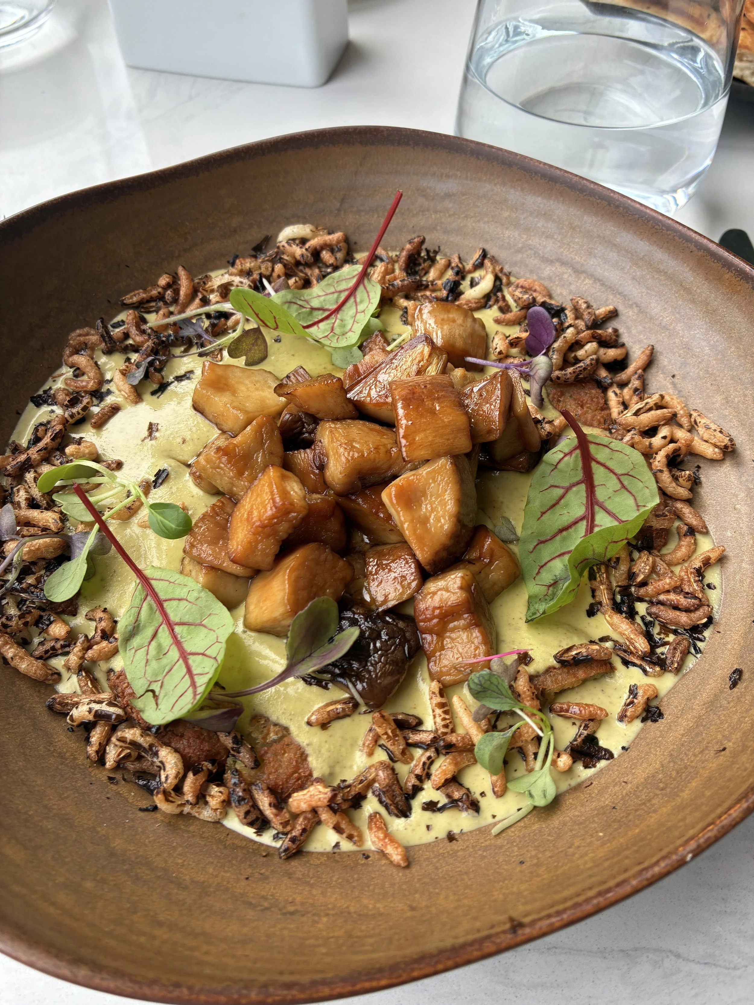 Tristan and I ate breakfast at a spot called Terravita, a restaurant which fairly summed up its character with the supercilious kerning of its menu header and the fibrous texture of the card it was printed on. I ordered the King Trumpet mushrooms with a Ponzu marinade, pistachio sauce, puffed wild rice, and Togarashi.