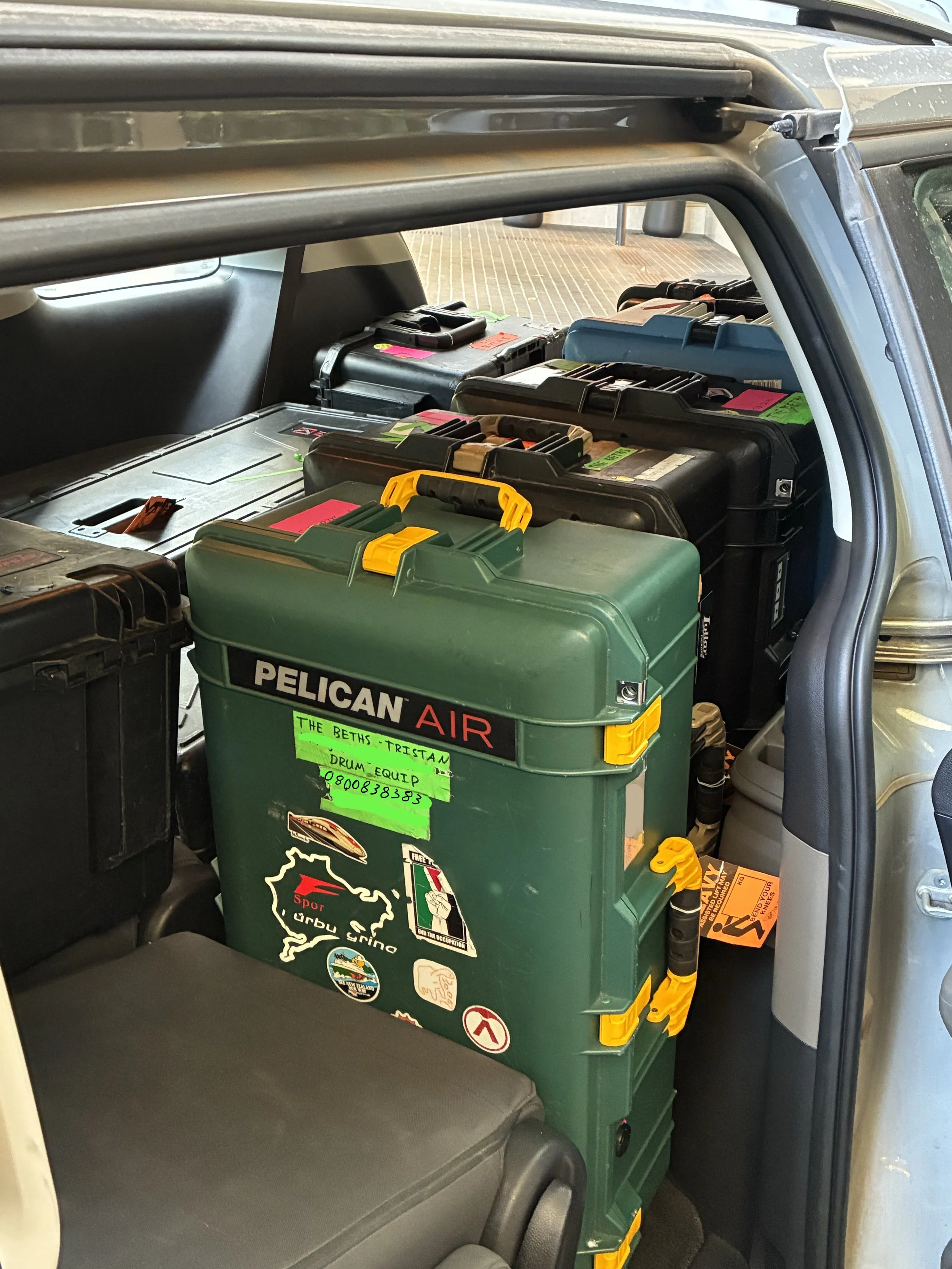 For the morning pack of the Kia Carnival we treated ourselves to a minor variation with the Pelican Air 1615s going vertically along the bottom of the cargo comparment instead of stuffed in the top.