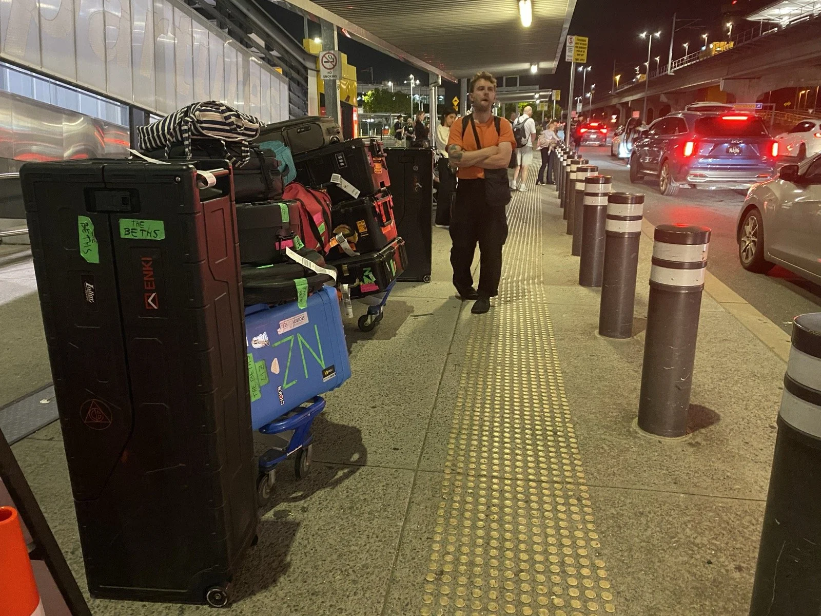 In the pickup area of Brisbane Airport waiting for Tristan to arrive with the rental car.