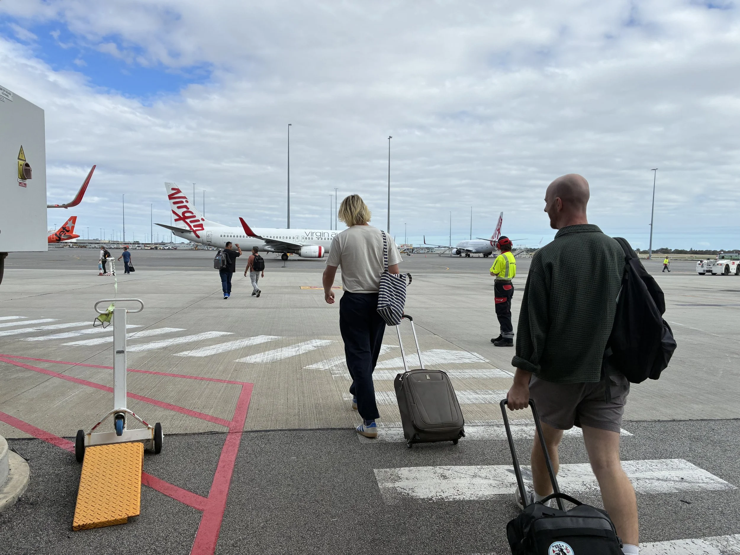 A compelling shot of our heroes striding out across the tarmac to board Virgin Airlines Flight 469 to Brisbane.