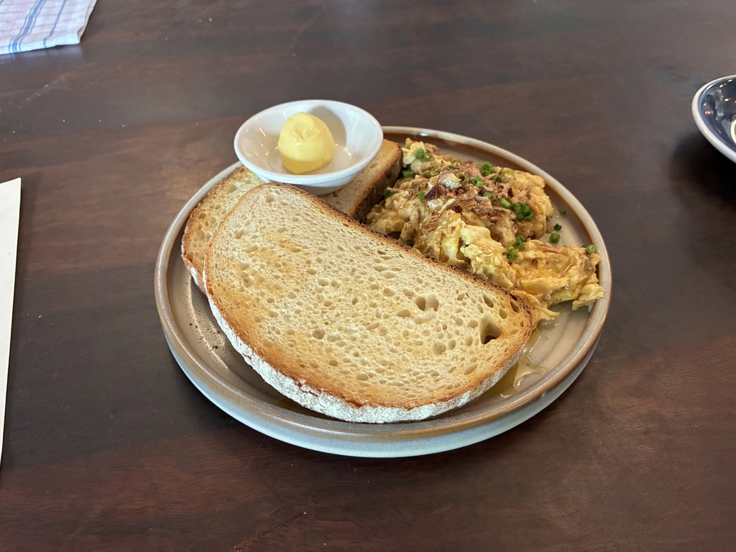 Here is my breakfast which I ordered at a cafe called Mount Street Breakfast Bar. The meal was called Shark Bay Chili Scrambled Eggs, with Aleppo butter, crispy onion, and sourdough.