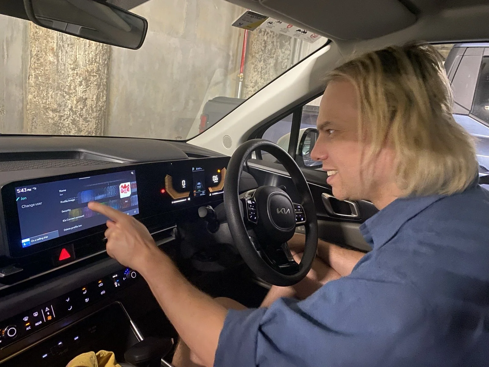 Here is a picture of Jon Kia-maxing. By the end of an afternoon of running errands in our vehicle he was highly fluent with the Kiaβs inbuilt computer and had set up a profile and managed to turn all of the warning beeps off (unfortunately they come back on each time you restart the car).