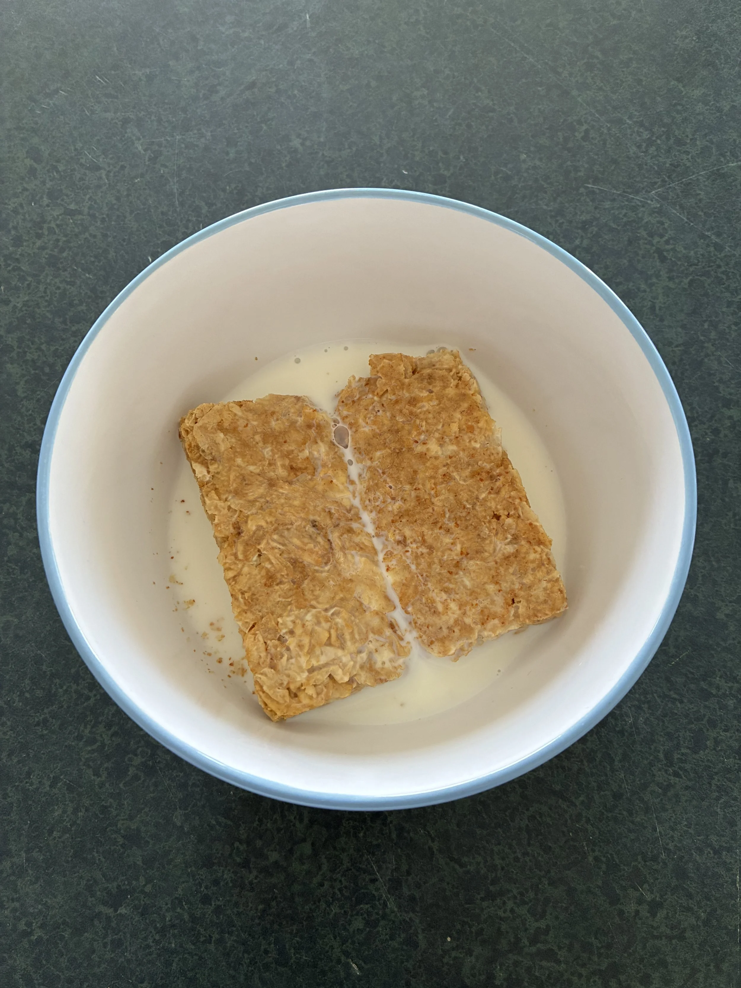 Here is my breakfast from our first rest day, a pair of Weetbix that were provided by our airbnb (they were found in the pantry in a box with lots of other Weetbix). I served them with milk and ate them quickly before they could soften.