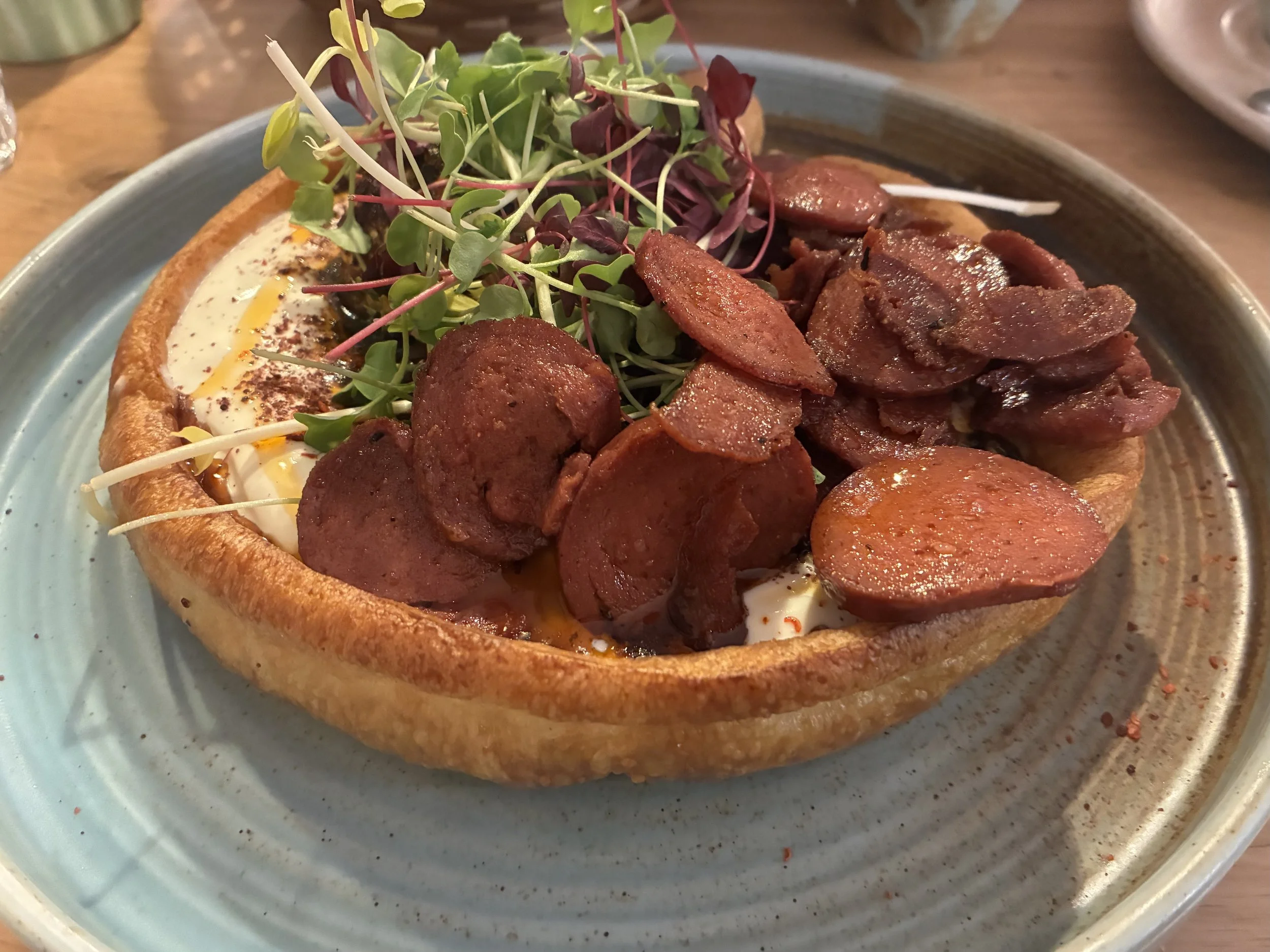 I began my day with a powerful breakfast to fuel me for the five hours I would be sitting in the back of our van. Not far from our hotel was a restaurant called Bruncho, an establishment that was steeped in the fine tradition of breakfasts containing two poached eggs but at the same time had its gaze set towards a future where a food menu is more than just a piece of paper that lists the chefβs creations. This menu was something I could participate in, an activation of the senses, a way to interact with your meal before you physically interact with your meal. When I ordered the Turkish Eggs, I had already examined this dish from every possible angle, seeing a bed of whipped garlic yoghurt contained within a large Yorkshire Pudding, poached eggs, microgreens, sumac sprinkles, chili oil, and slices of Turkish Sausage. When it arrived at the table I felt like I was reuniting with an old friend.