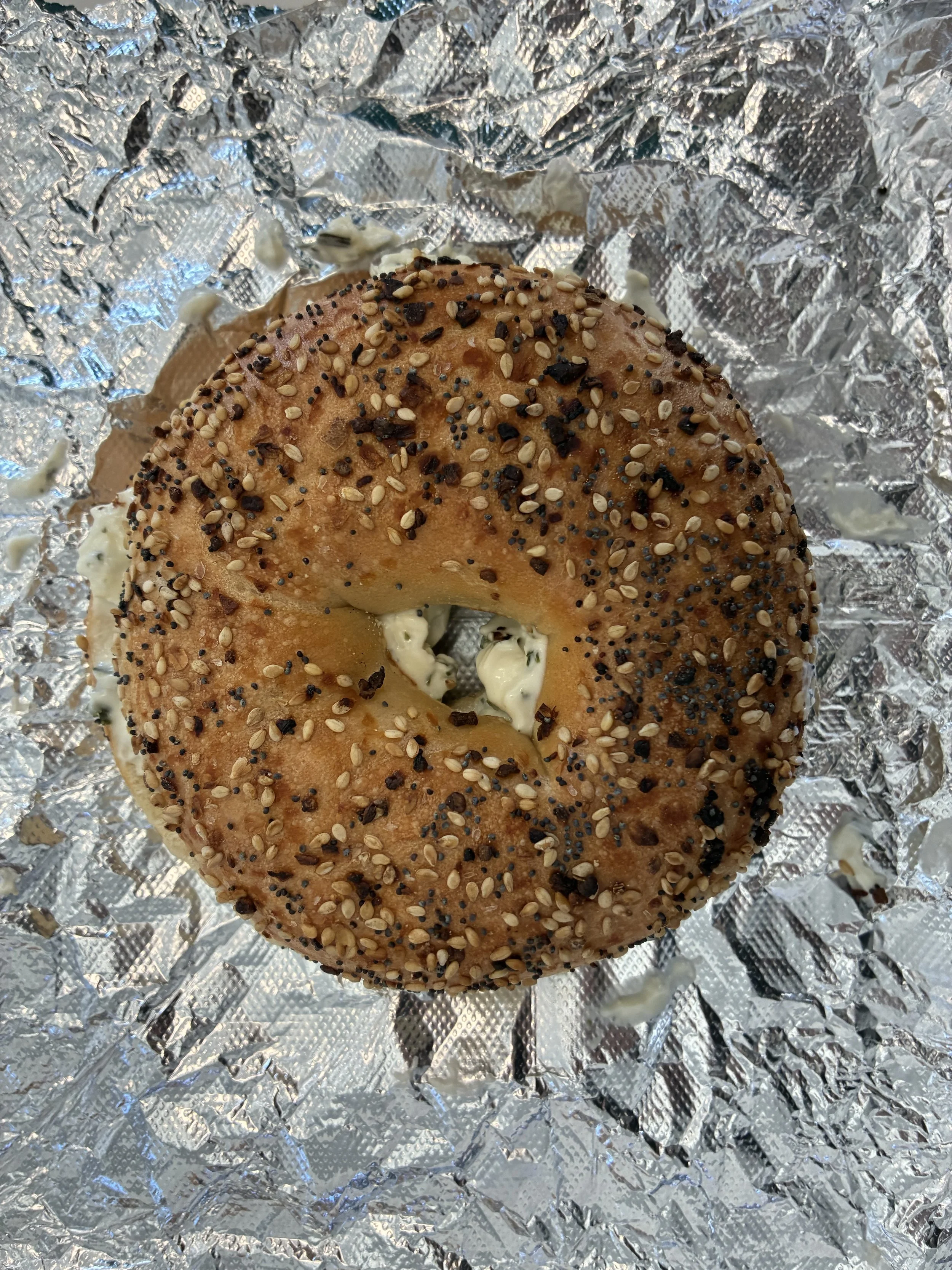 I found my breakfast at one of these places where you have to order on a touch screen, but it is so difficult to use that they have an attendant to guide you through the process. The thing that I so struggled to order was an ‘everything’ bagel with cream cheese and chives, a safe and predictable airport staple-food and one of the most challenging breakfast foods to photograph.