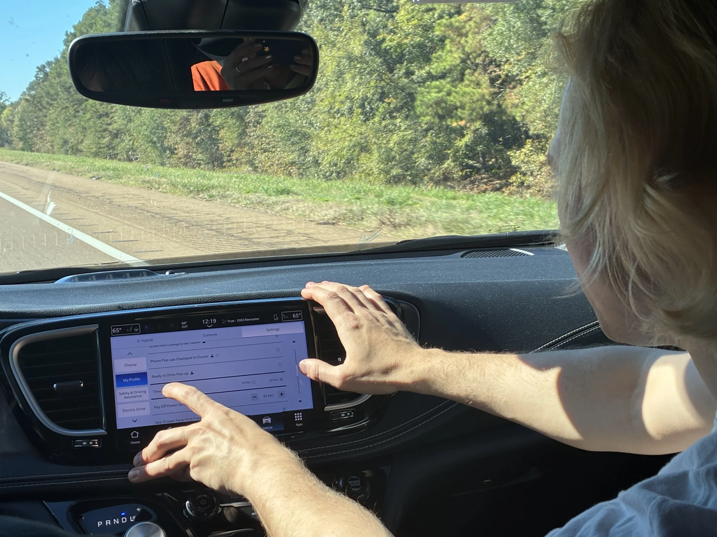 The convoy departed the Texarkana Central Mall Megaplex and headed west on Interstate 30, journeying through a terrain of farms, swampland, strip malls, road works, and billboards. Jon kept himself busy by attempting to reason with the stubborn artificial intelligence that masquerades as the controls and settings menu for the Chrysler Pacifica. He did manage to change the equaliser for the stereo but never quite figured out how to adjust the clock to the correct time.