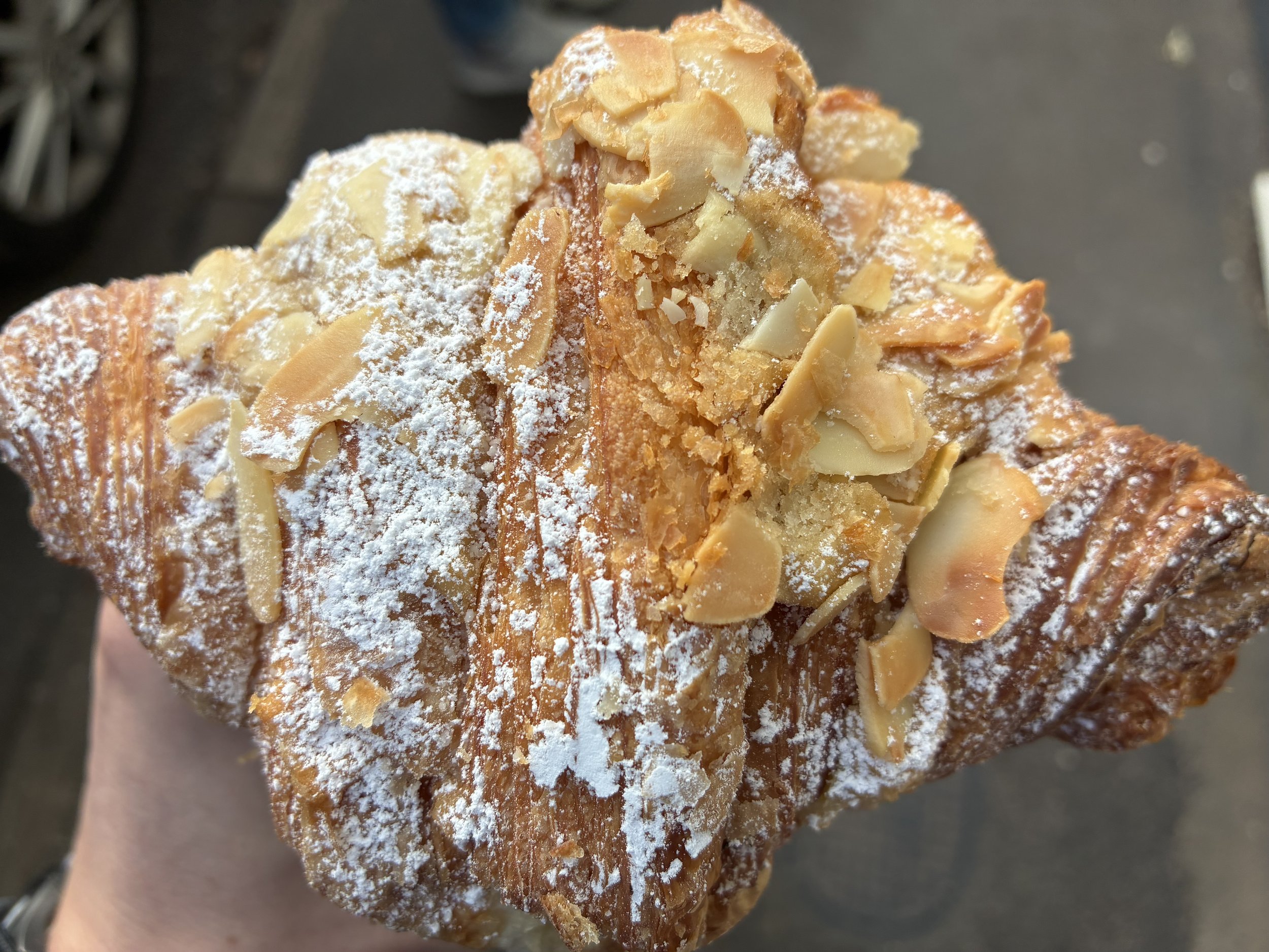 Tristan and I travelled to a rehearsal space to play music with our friend, a very fine guitarist by the name of Michael Gianan. We had a light breakfast at a nearby coffee shop, and I picked out an almond croissant for myself from a pile of almond croissants.