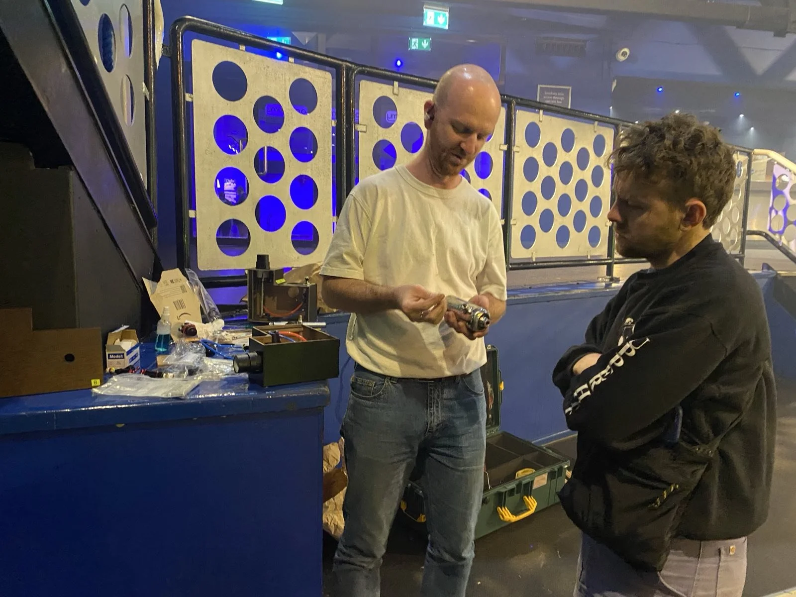 This was a special show as it was a trial for a new and powerful technology that the band now possesses. Tristan has been tinkering in his garage for the past few months and has finally cracked the system for saving crucial seconds in the middle of one of our songs by delivering a recorder into the hands of a musician without him having to reach down for it. The Recorder-Me is an ingenious device, a foot operated launcher that uses a small explosive charge to launch a recorder (or other woodwind instrument of 30mm diameter or smaller) up to 60 meteres into the air. In the case of most venues they are finely calibrated to operate at a height of around 1.5 metres for the safety of band and audience.
