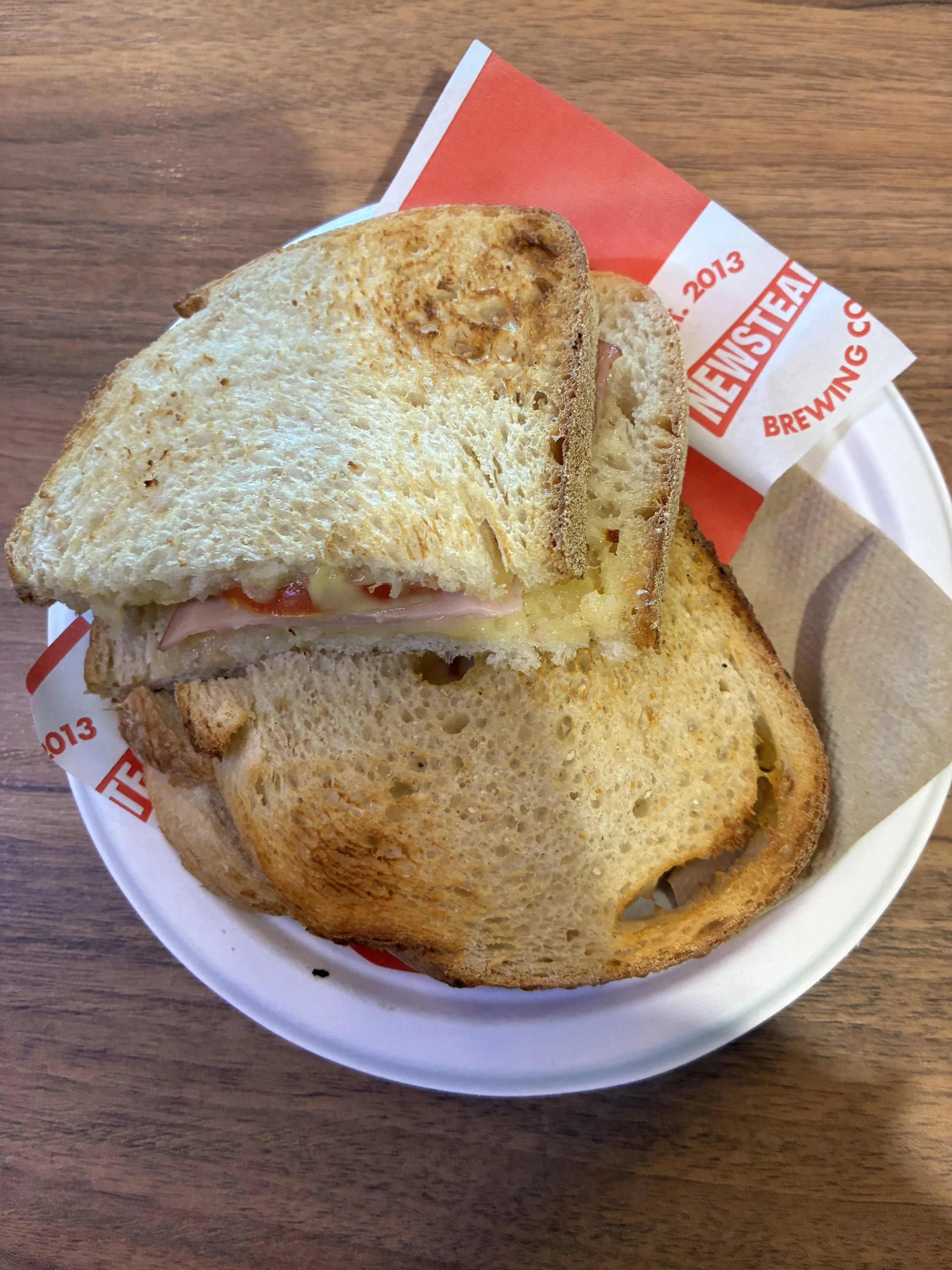 I picked up breakfast from an anonymous terminal cafe close to our gate. It was an item called Ham, Cheese, & Tomato Sourdough, and it came heated and served on a paper plate.