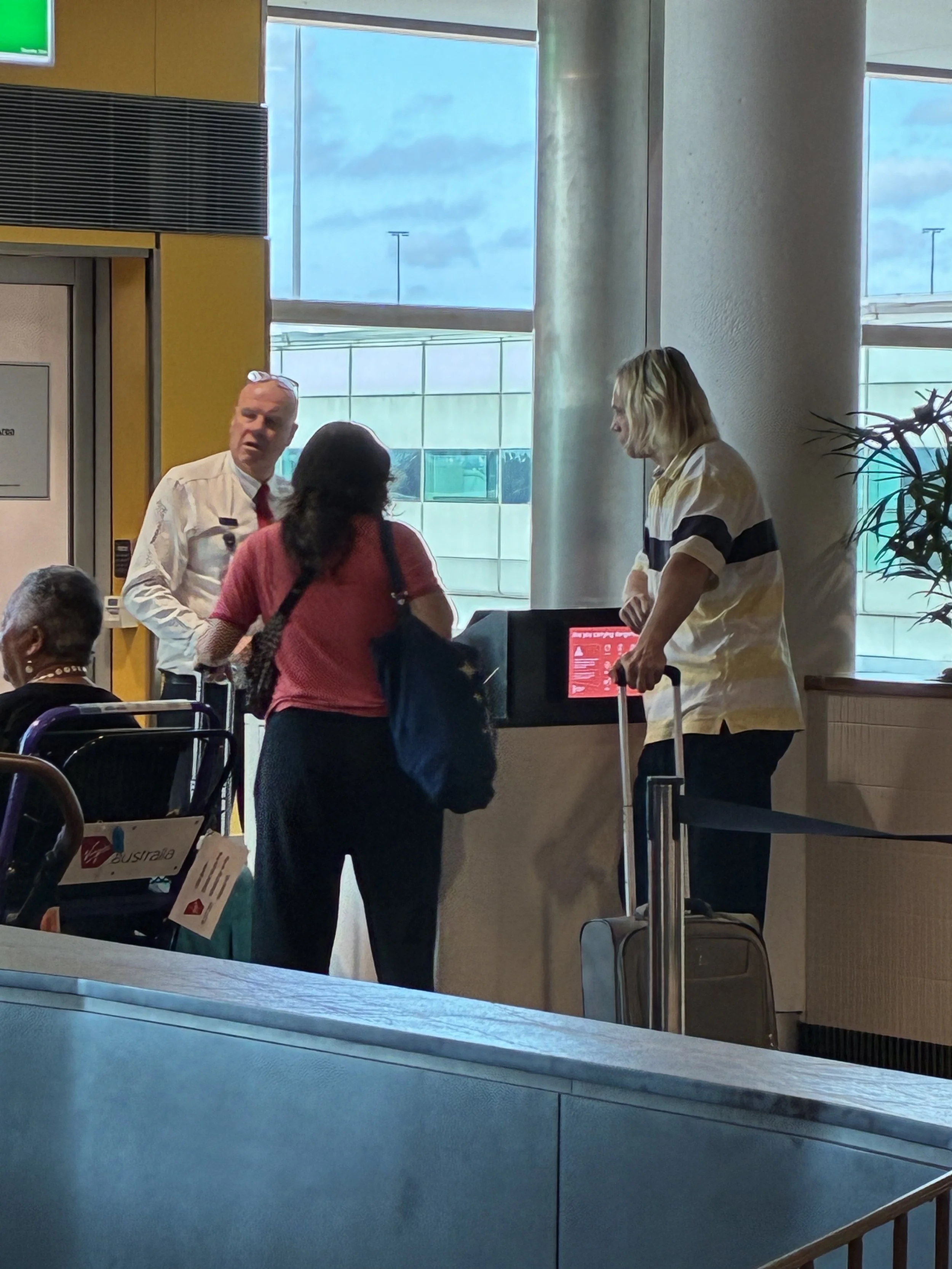 Brisbane Airport was determined to punish us yesterday morning. We arrived at the dropoff at 8am and I left everyone to shuttle the baggage inside, driving off in the rental car to fuel up and return it. It was a good half hour before I was back at the terminal and I was decidedly worried to find everyone at the oversize/group check-in area with a pile of equipment cases that should have already been on their way to the aircraft.