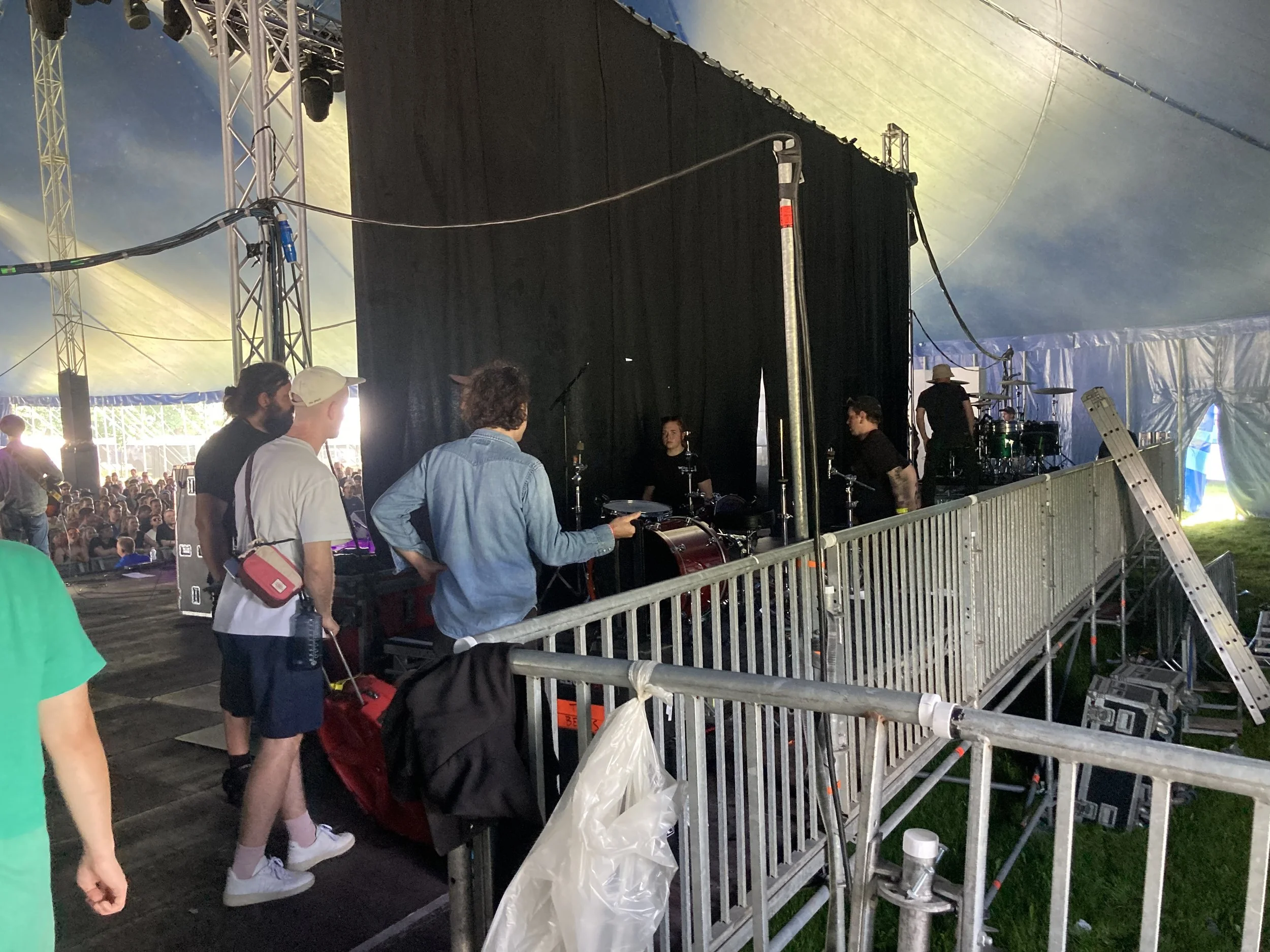 They couldn’t fit our green room next to our stage so it was placed at the next stage, down the hill. That didn’t matter anyway as they didn’t end up delivering our rider. There was a stage manager at our stage but still there weren’t any communication or instructions given to us. We had everything prepared for speedy changeover, a task which we had twenty minutes to execute. Or actually five minutes I guess because the stage was running late. It must have looked like a flock of sheep being released into a field, as our drum riser and guitar riser were wheeled out onto the stage by plentiful stagehands, none of whom know where anything was supposed to go. There was supposed to be a bass amp provided, and we did find a very large speaker cabinet, but no one knew where the amplifier was.