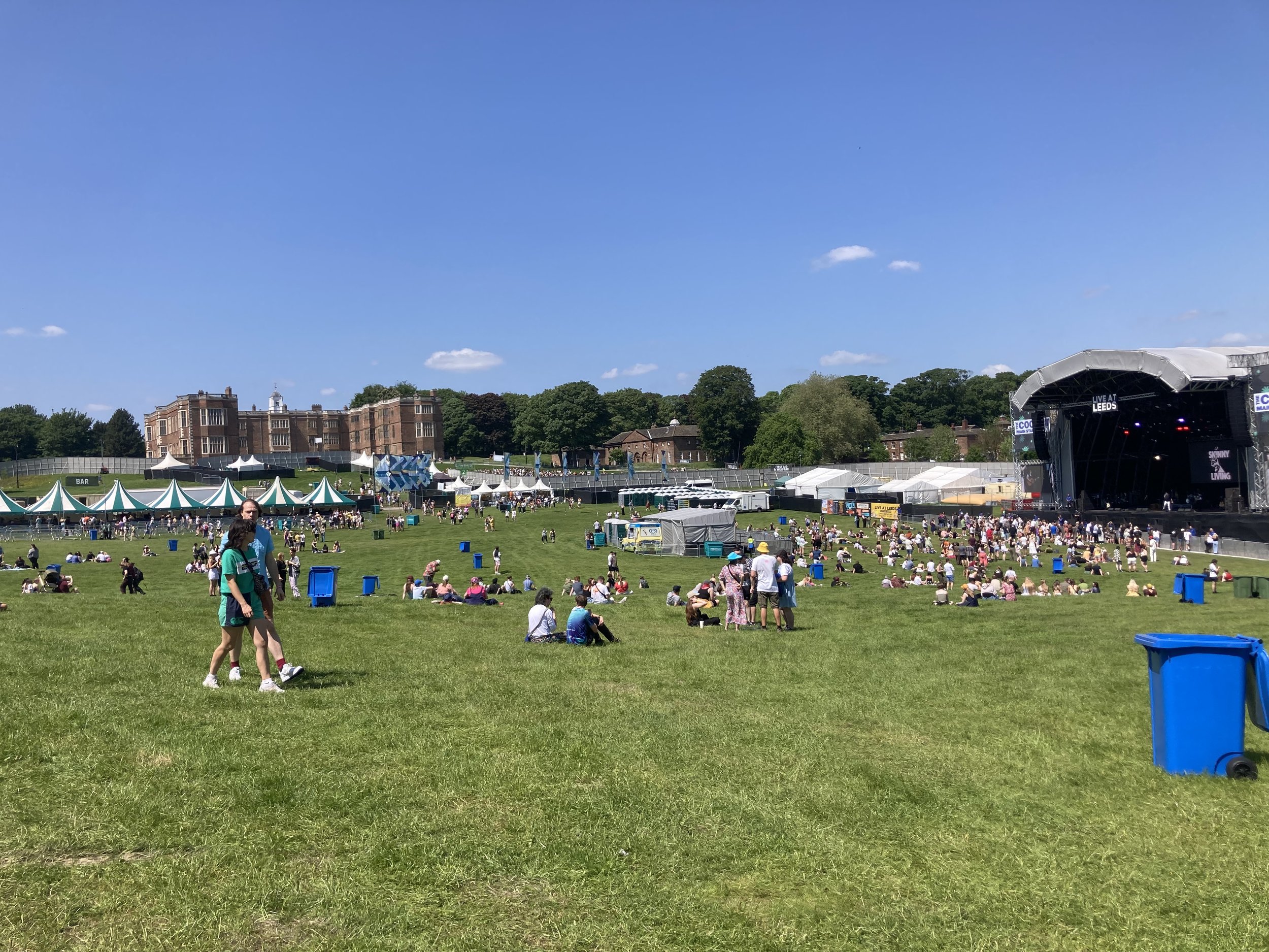 The drive was only a couple of hours. A38 took us past Derby and then hooked east to get us onto M1. We continued north past Sheffield and then took a bit of a squiggly route that brought us into Leeds from the east. As we pulled into Live at Leeds the first thing we saw was an impressive stone manor neatly planted on the hill overlooking the festival grounds. This was Temple Newsam, a Tudor-Jacobean house with grounds sculpted by Lancelot “Capability” Brown, famously known as England’s greatest gardener.