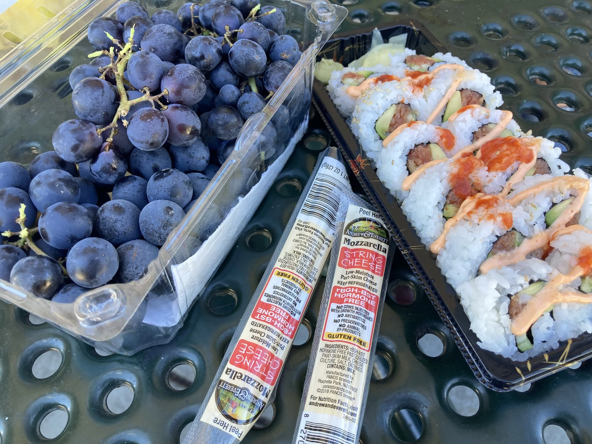 After driving for an hour it was decided on that we stop for breakfast at a Sprouts just off the highway. I bought myself a punnet of table grapes, two mozzarella sticks, and a tray of Spicy Roll Tuna Sushi.