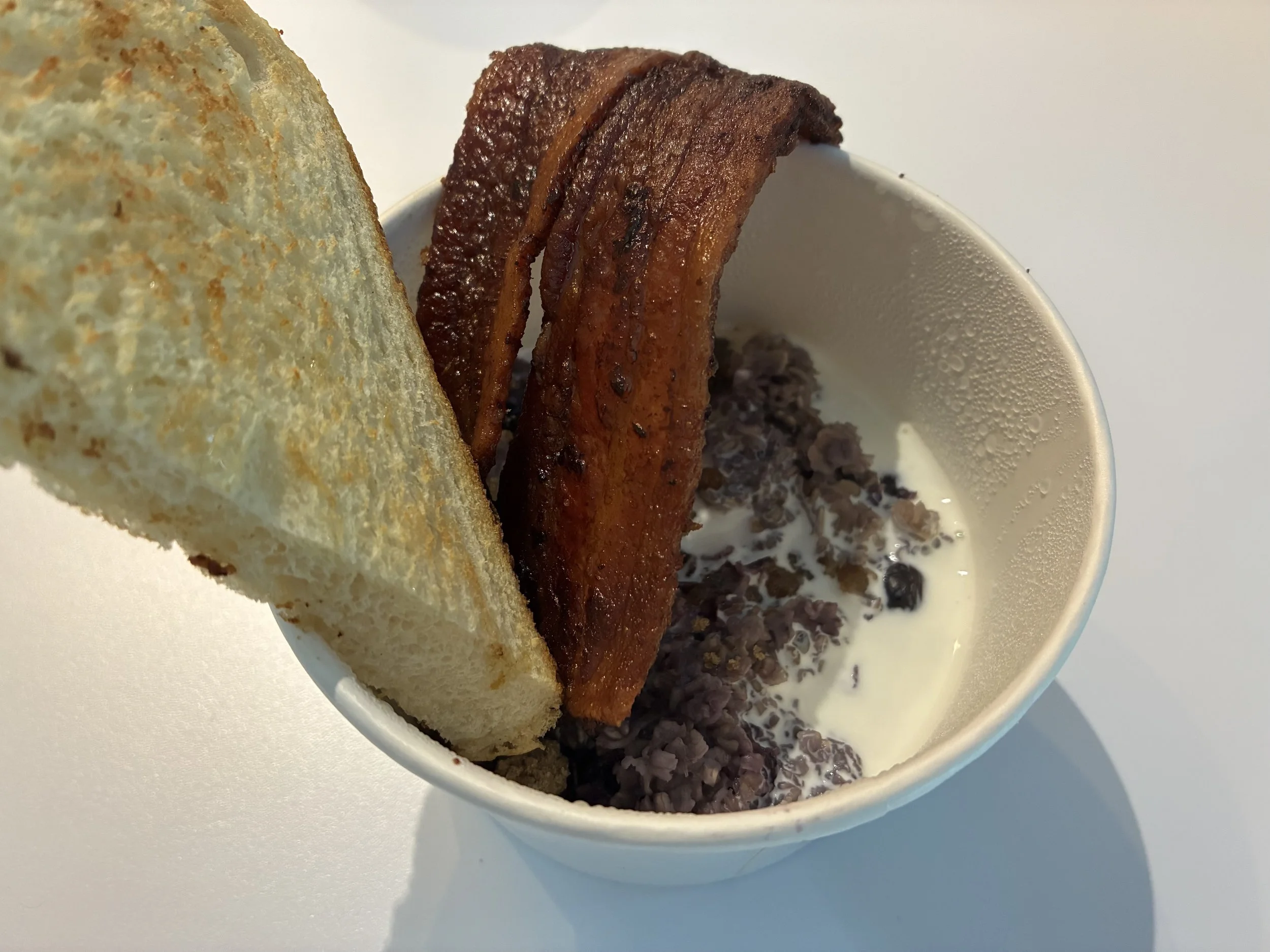 Shortly after 11am everyone piled into an Uber and we made the trip to Easy Street Records in West Seattle. One our great quests as a band is to sign every single vinyl record that goes out into the wild, a task that we toil at disc by disc, day by day, tracking them down wherever we can. This record store was making things simple by bringing us to the location of a large amount of our records so we could sign them all with speed and consistency. They also let us order breakfast from their café, a welcome influx of convenient food that came at a vital time. I ordered the Hall & Oates which was a cup of oatmeal and a side of fruit served with two strips of bacon and toast.