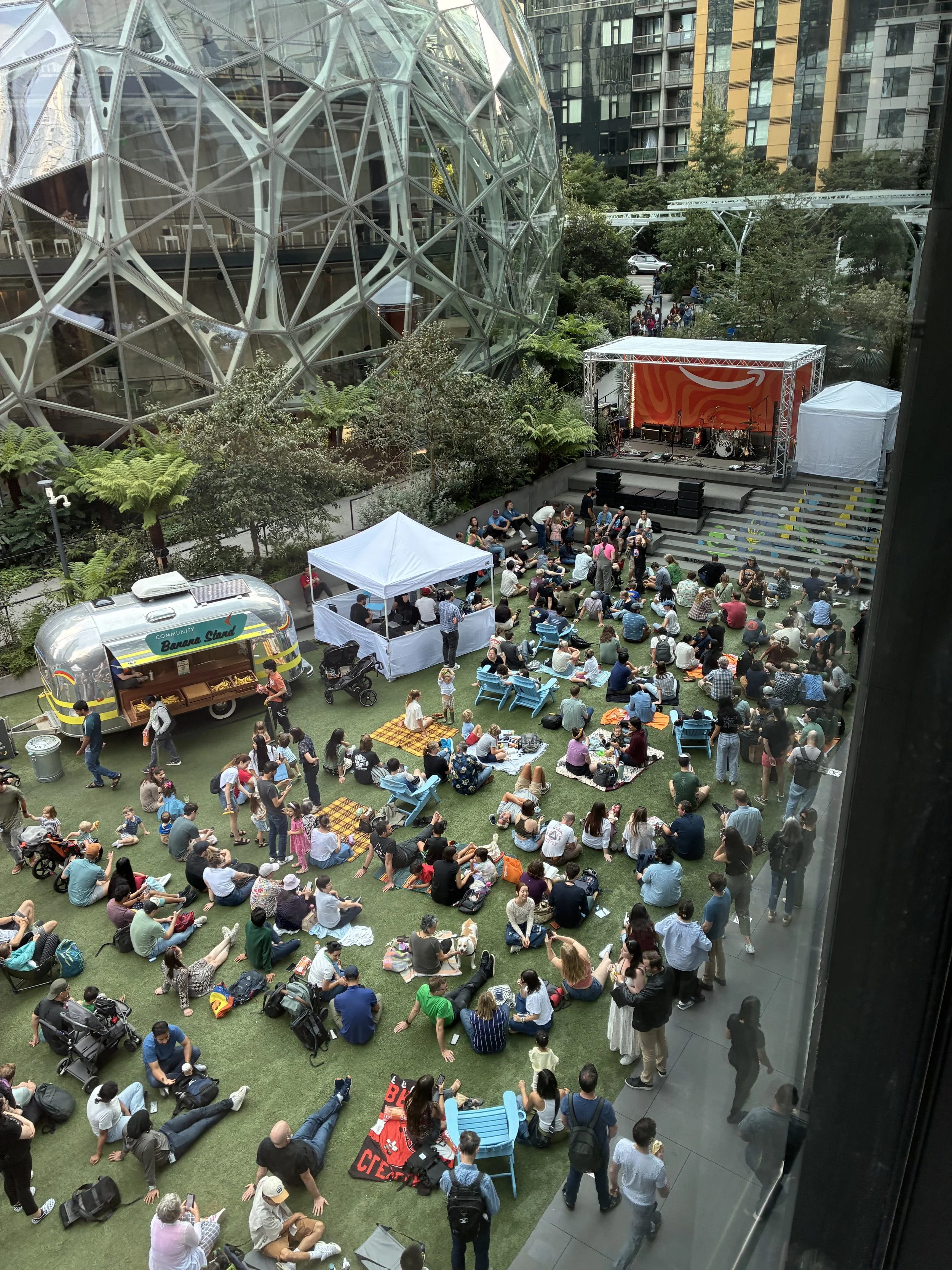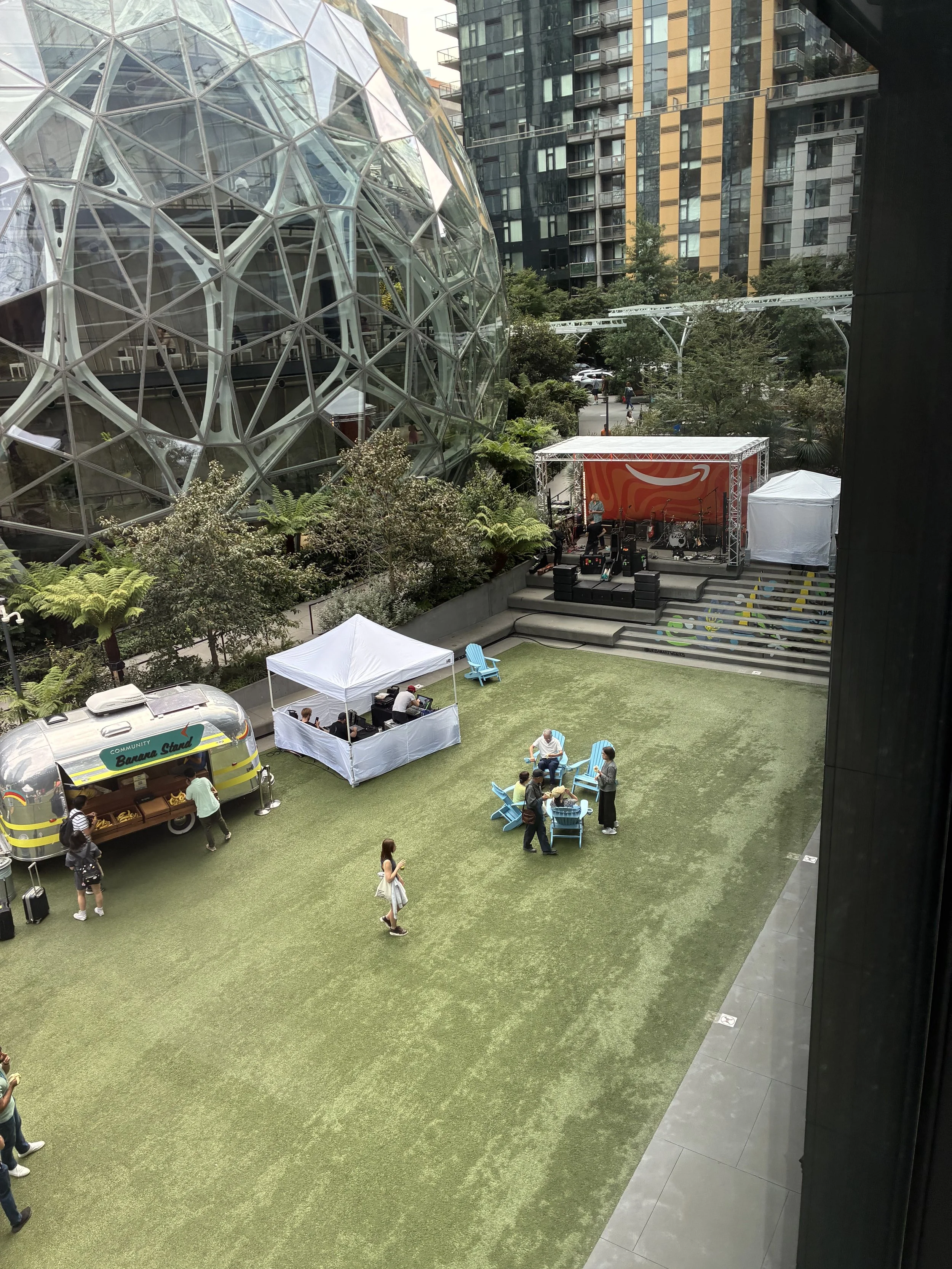 Next, we headed to downtown to setup for our show. We were back at the Amazon headquarters in Downtown Seattle surrounded by mirrorball skyscrapers, futuristic domes, and lush greenery that felt plucked from a rainforest. The community banana stand was in full swing slinging fruit to workers and passers-by and sun chairs were scattered around on the green for those who had time in their day to stop and enjoy the fine weather that the city was enjoying.